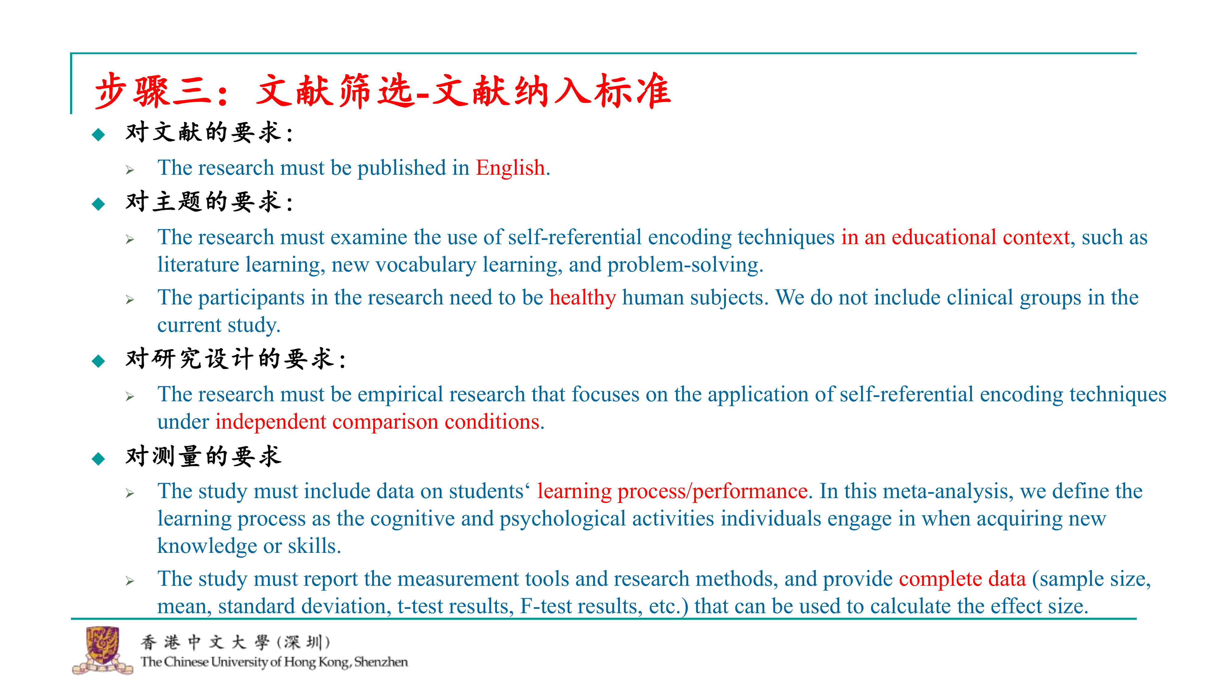 在完成文献检索之后,下一步是进行文献筛选。为此,我们需要制定一套文献的纳入标准。这些标准相对标准化,包括对文献本身的一些要求。例如,我们可能仅关注英语文献,认为这已经足够。因此,我们会要求文章必须是英文撰写。关于主题,我们要求文献必须与教育教学相关,因为即便使用了教育教学的关键词进行数据库搜索,结果仍然可能比较宽泛。因此,我们需要仔细地逐一挑选。 我们希望查看在普通人群中的效果,所以选择以普通人为被试的研究。在研究设计方面,我们要求必须有独立比较组,即实验条件下的对照组。那些仅采用单组设计、缺乏对照组的研究可能在我们看来不够严谨,因此会被排除。 在测量方面,我们同样有要求。例如,我们关注的是教育效果或学习效果,因此需要报告与学习过程或表现相关的指标。此外,我们还需要完整的数据,如总被试数、均值和标准差,或者可能提供的t检验、f检验结果等,这些数据能帮助我们计算效应量。如果文章中没有这些统计数据,比如一些较早的心理学文章,那么对于元分析来说,这些数据就无法使用。