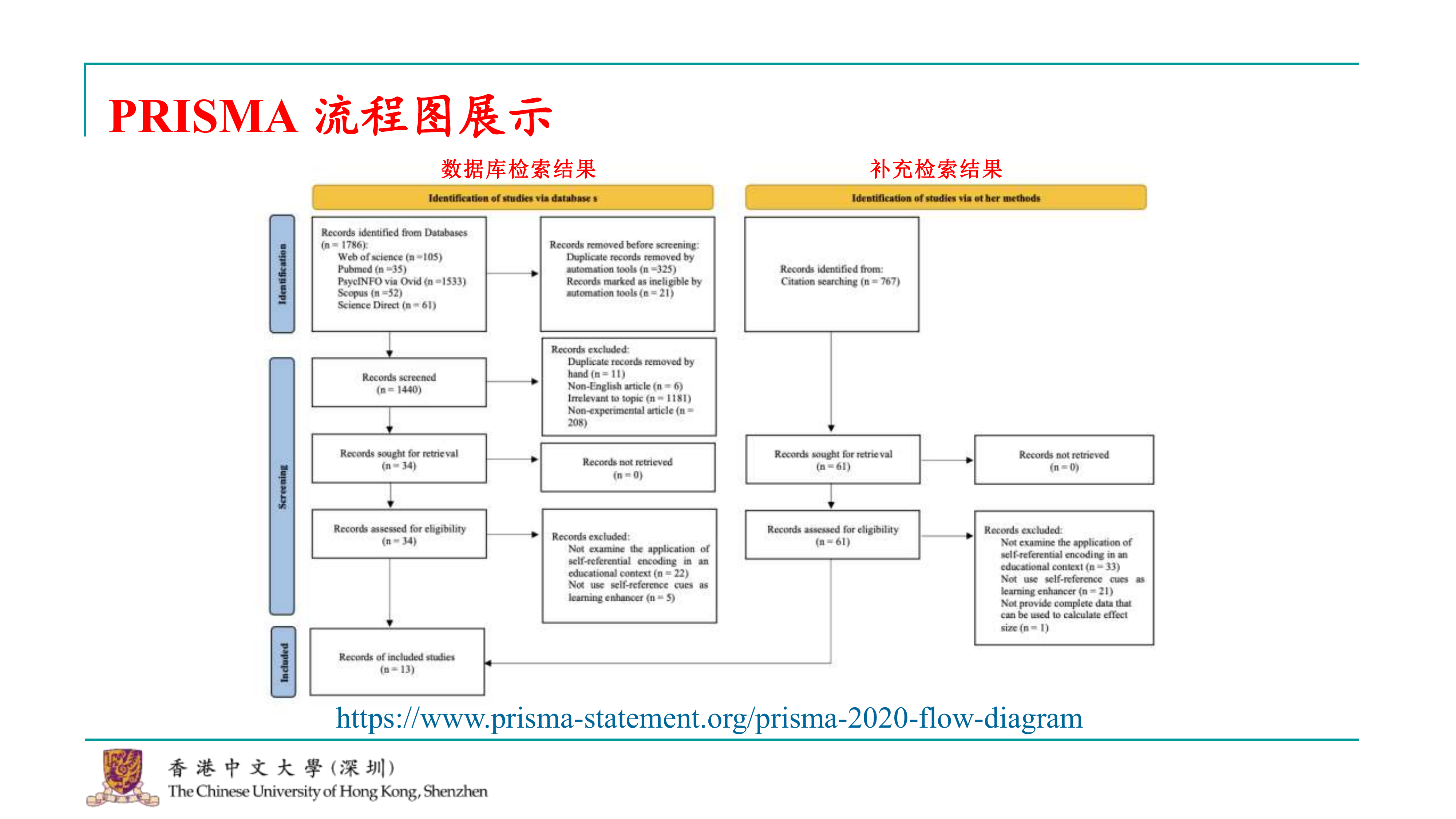 好的,那么元分析的前期流程,实际上可以用一个PRISMA流程图来展示。这几乎是每个元分析都要求做的事情。PRISMA流程图的网站链接我也已经提供,大家可以下载。网站上有一个模板,上面没有填写具体内容,你可以根据这个模板来填写你的数据库检索信息,以及最终纳入的文章。 在我们这个研究中,我们首先从数据库进行检索,然后从每个数据库得到一系列文章。在这个阶段,我们可能会进行去重处理,因为每个数据库可能会出现相似的文章。去重之后,我们根据之前的排除标准开始筛选这些文章。一开始可能会进行粗筛,比如手动找出重复的文章,非英语的文章,或者与主题完全不相关的文章。这样做一轮之后,可能会有些文章难以判断,这时你就需要查找这些文章的全文PDF,仔细阅读摘要,才能判断它们是否有用。 到了这个步骤,你通过阅读摘要来判断文章是否可以被纳入。这就是数据库检索的过程。同时,我们还会进行补充检索。将数据库检索和补充检索的结果合并起来,就得到了我们最终纳入的研究。PRISMA流程图能够清晰地展示从检索到筛选的整个过程,确保研究的透明度和复现性。