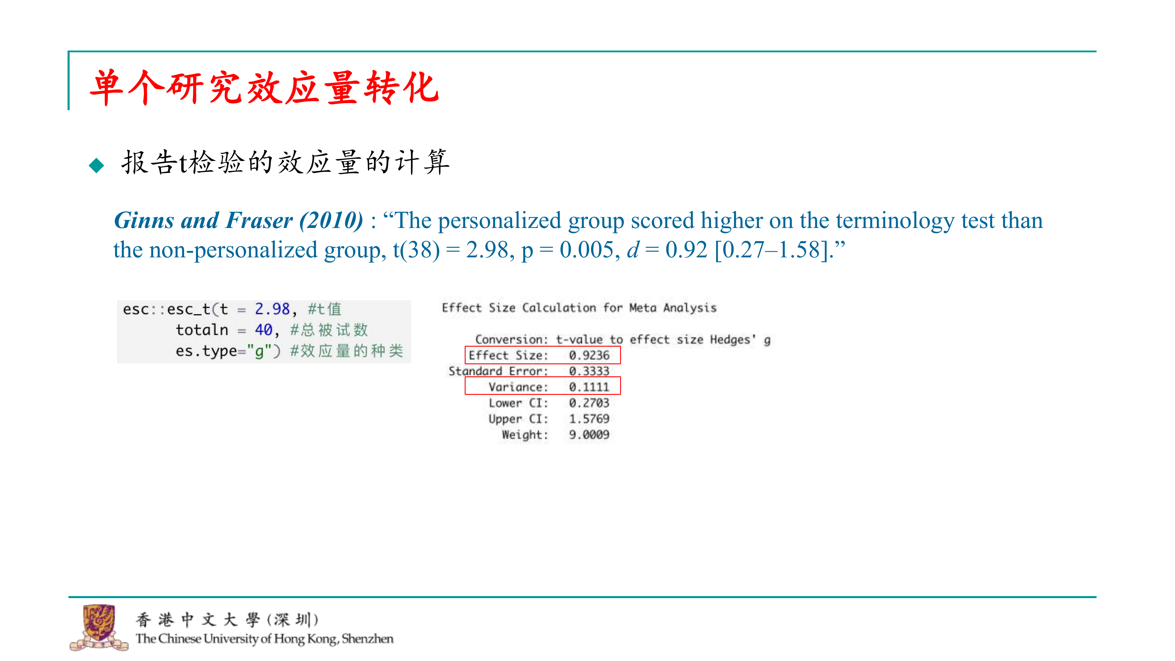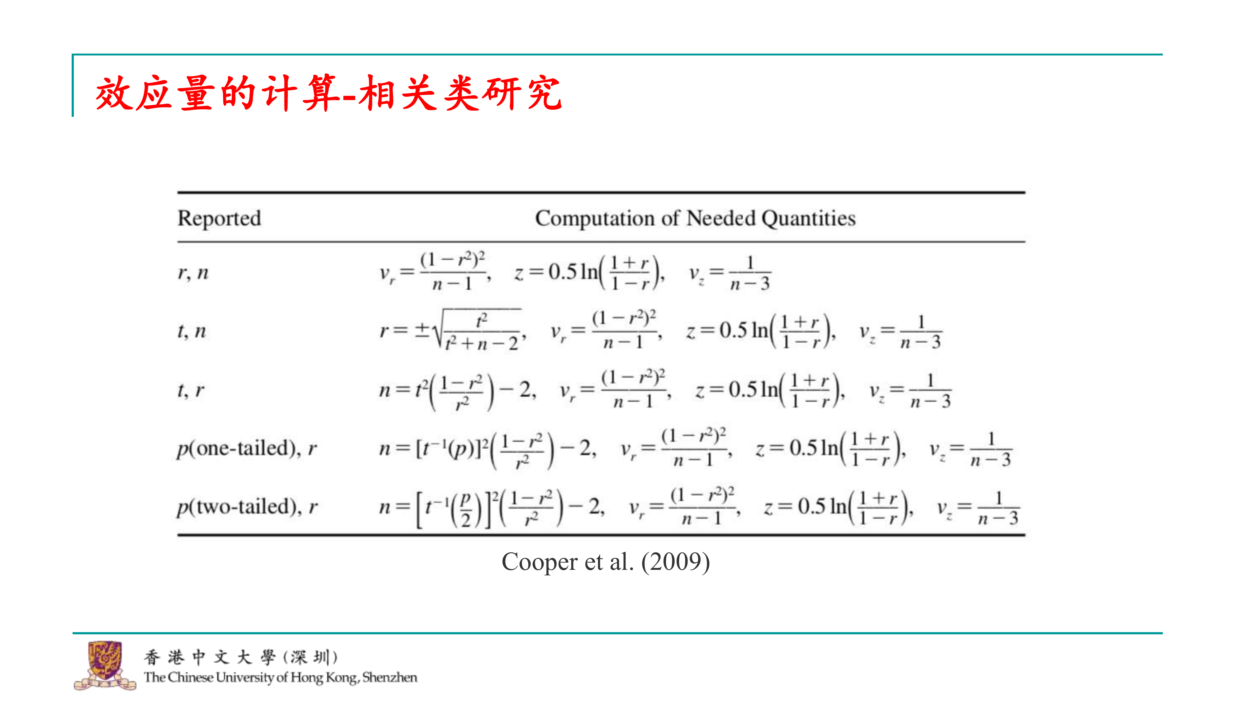 关于效应量的计算,我在这里可能不会详细讲解公式的具体内容,但我推荐了Cooper的这本书。在这本书中,他详细列出了各种情况下如何计算效应量,比如独立样本、配对样本、相关研究等。有了这样的参考,如果你遇到了一些难以处理的效应量转换,比如esc包中没有包含的某些效应量,你可以自己编写一个函数来计算,这通常只是基本的算术操作。 由于时间限制,我可能不会深入讲解这部分内容。如果大家对计算效应量感兴趣,可以在课后自行查阅相关资料进行学习。Cooper的书籍是一个很好的资源,可以提供详细的指导和公式。此外,R语言社区也有很多资源和学习材料,可以帮助你更好地理解和实施效应量的计算。