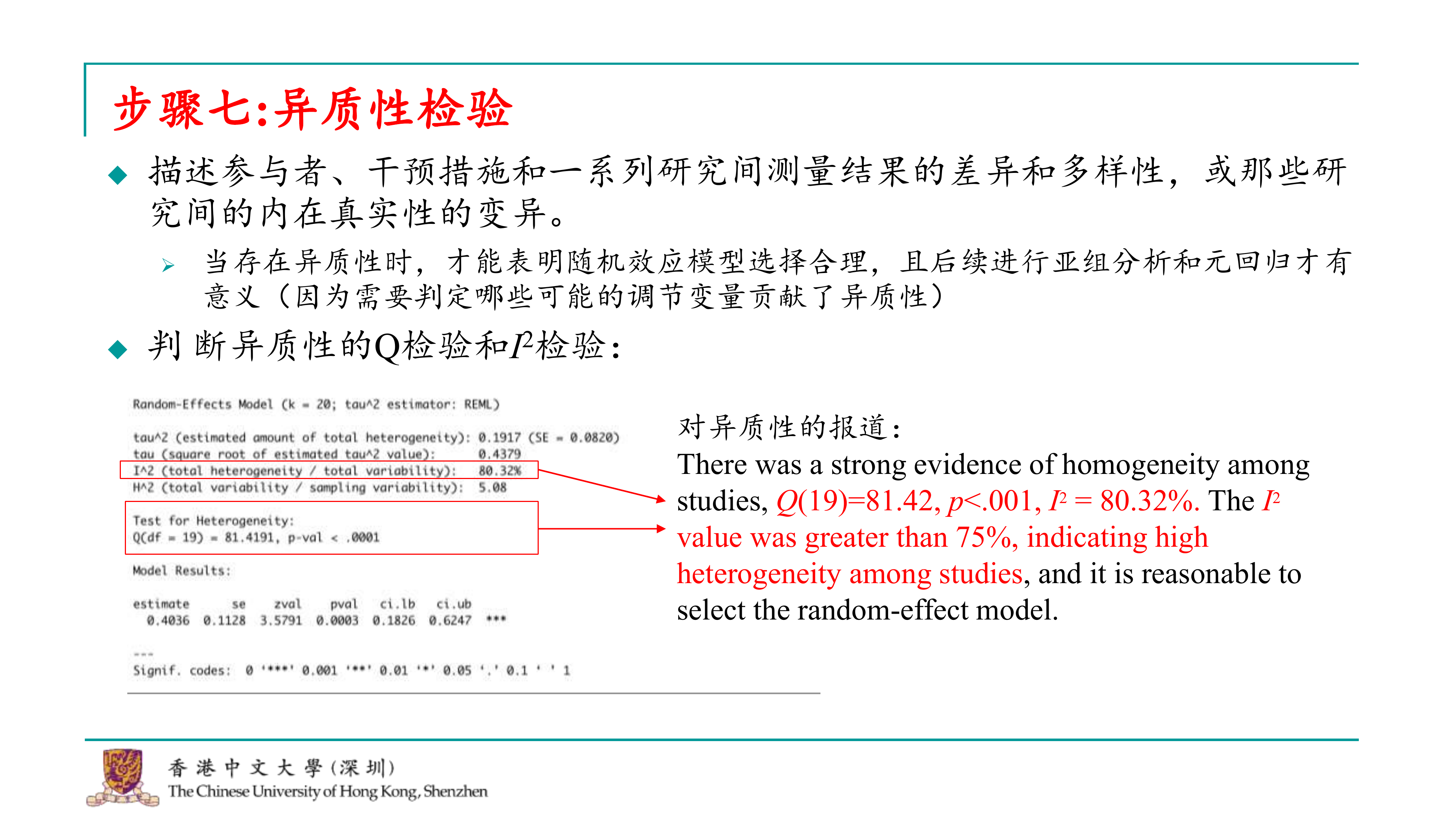 在metafor包中,异质性的评估通常是通过Q检验和I²统计量来进行的。这些统计量在元分析的第一步输出中已经给出,因此不需要编写新的代码。