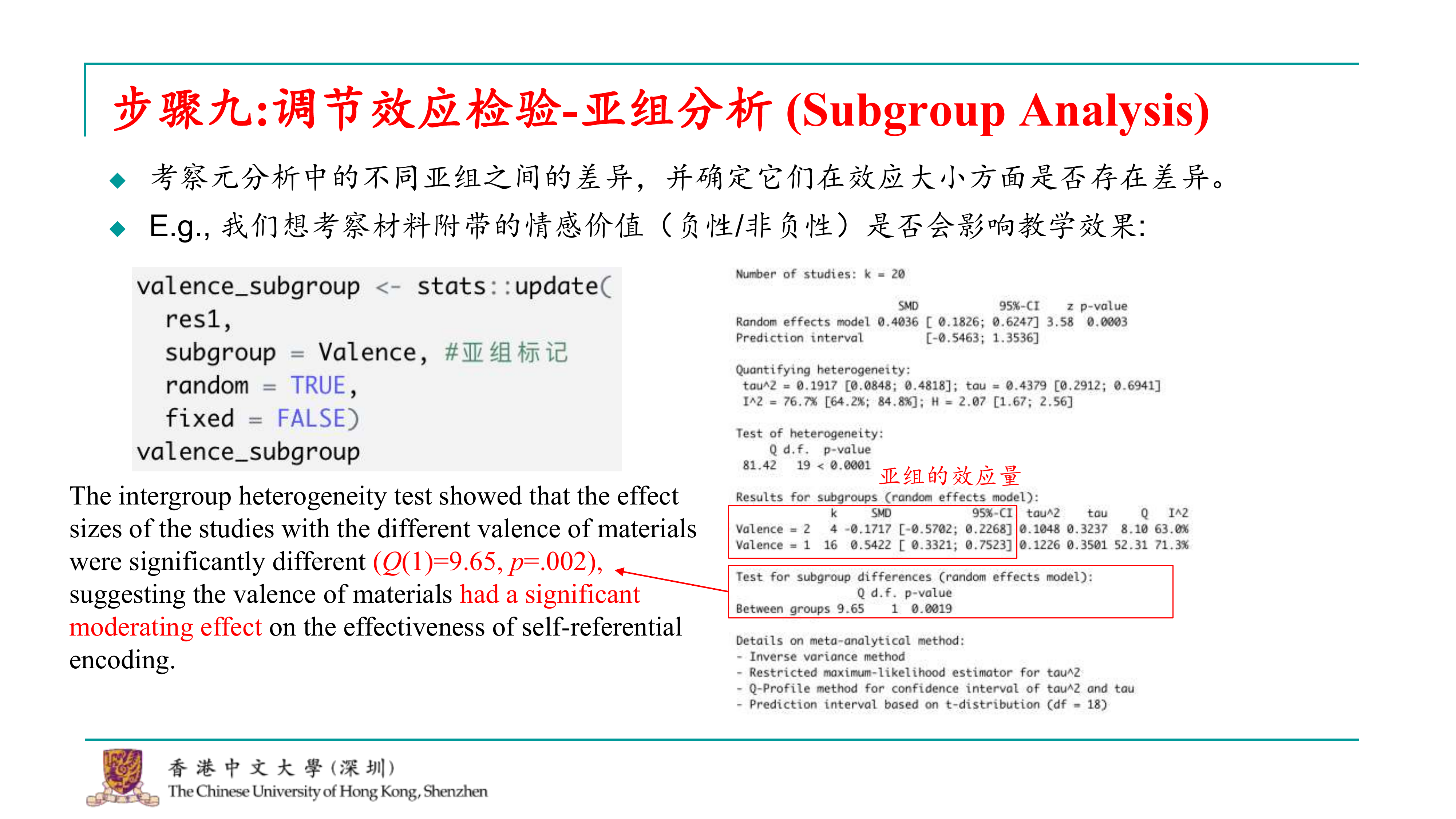 在报告亚组分析的结果时,我们通常会报告q检验的值和p值。如果p值小于常用的显著性水平(如0.05),则表明亚组效应是显著的,即情感价值是效应量的一个显著调节变量。