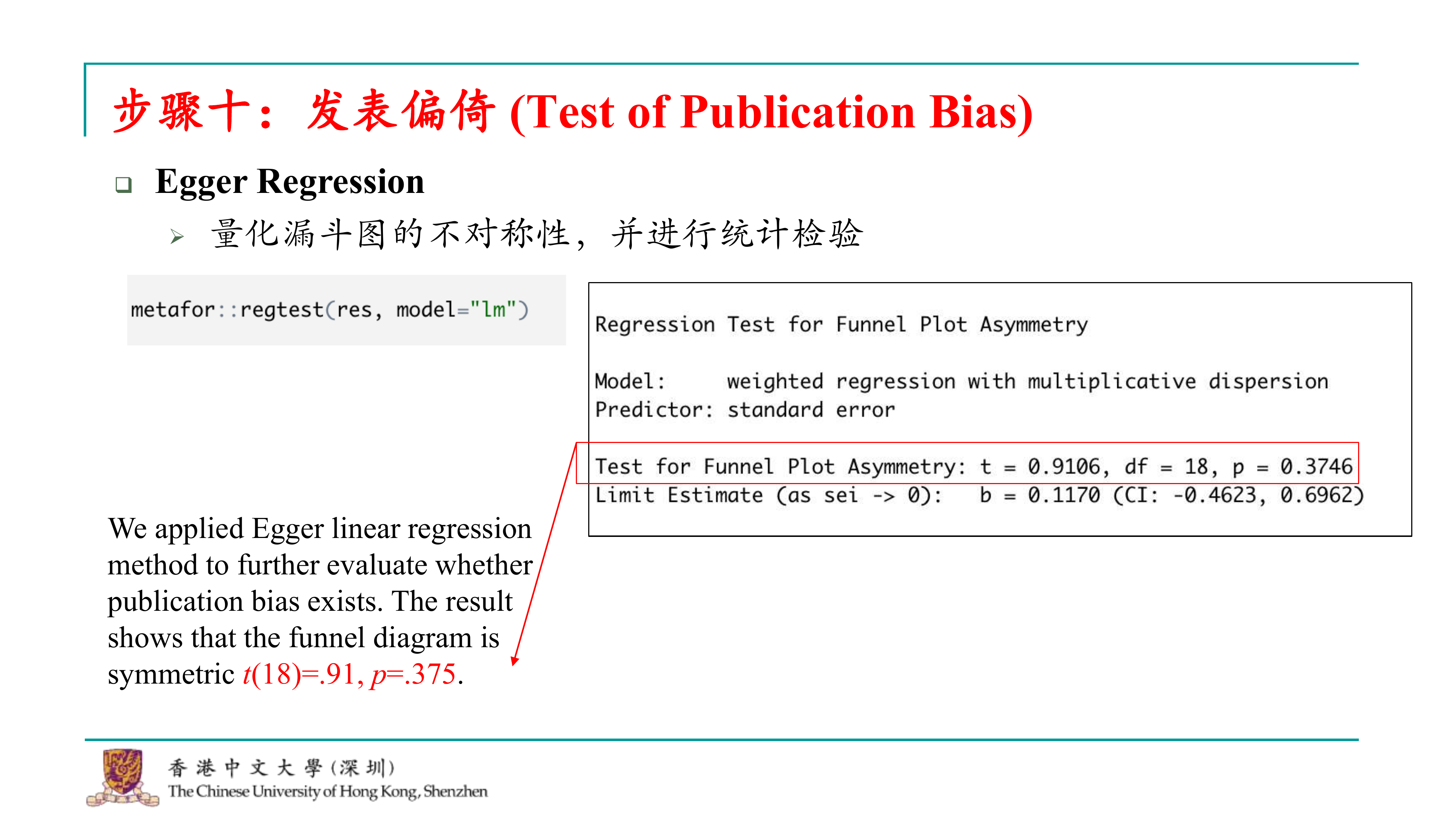 在元分析中,为了确认是否存在发表偏倚,除了使用漏斗图进行可视化分析之外,还需要进行统计检验。这通常是通过Egger’s regression来实现,它可以提供一个统计量来评估漏斗图的对称性。如果Egger’s regression的p值不显著,这通常表明漏斗图是对称的,从而暗示没有发表偏倚。