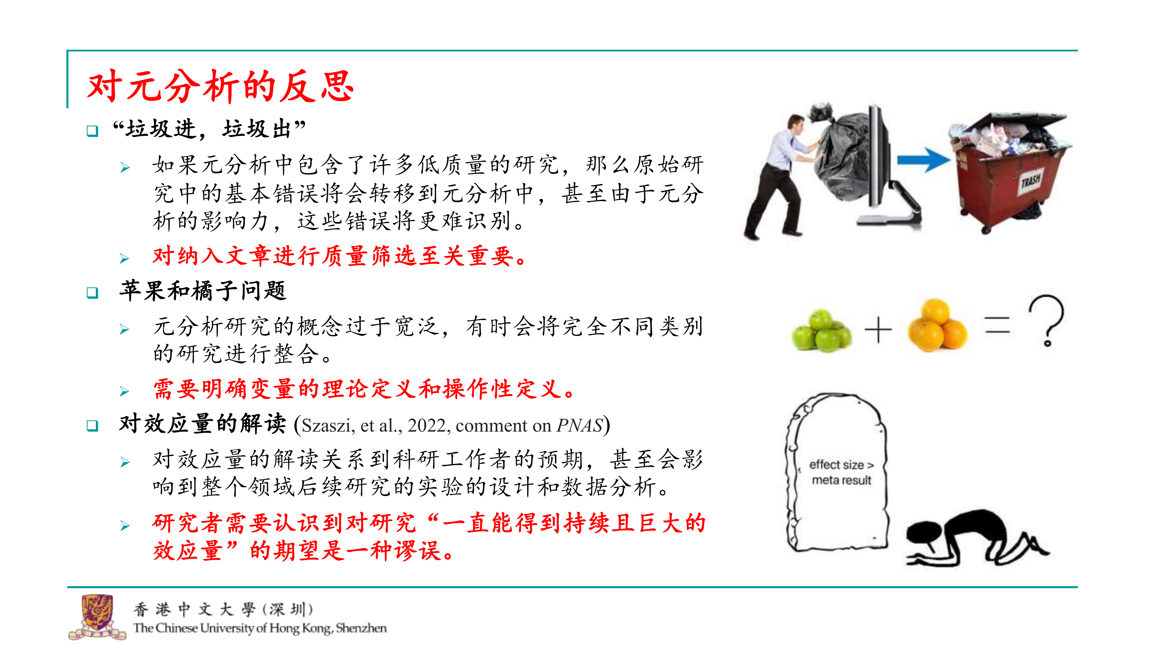 好的,如果大家没有问题,那么我们今天的课程就到这里结束。现在关于元分析的资源非常丰富,但要想真正掌握元分析,最好的方法还是亲自去重复别人的元分析或者自己进行一个小规模的元分析。我个人经验,进行元分析不是一次性的任务。你的文献检索、数据分析可能需要多次迭代,过程中可能需要一些调整和完善。因此,一开始就确保你的文件、编码簿等非常规范是非常重要的,这样在后续的重复和迭代过程中,你会有一个明确的依据。现在,元分析也不仅仅是发表一篇独立的文章,很多人在他们的毕业论文中,如果包含了多个研究,最终会进行一个小型的元分析,以综合这些研究的整体效应量。这种做法在国内也相当普遍,这种小型的元分析被称为mini meta-analysis。确实,很多人都在这样做。