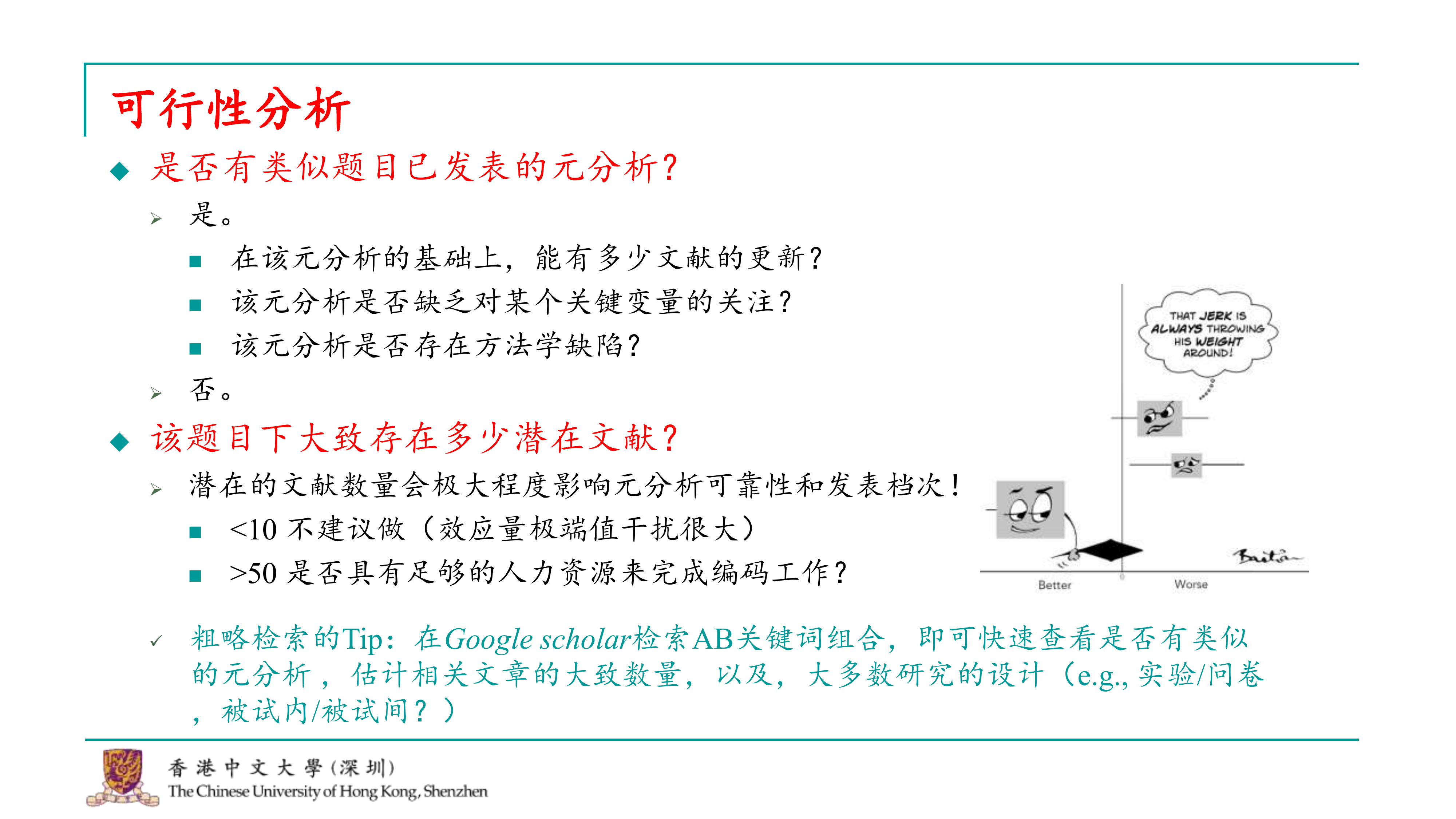确定了研究问题之后,下一步是评估这个研究问题的可行性。这里有几个关键点需要考虑: 1. 检查已有研究:首先,你需要查看是否已经有人发表了关于这个主题的元分析。如果有的话,并不意味着你不能进行你的研究,但你需要考虑是否能够为已有的研究增添新的内容。这可能包括更新文献、探索新的调节效应,或者纠正之前研究的方法学缺陷。 2. 文献量:如果你决定进行元分析,你需要考虑你将纳入的文献量。文献量对于元分析的重要性非常高,因为它直接影响到你研究的稳健性和发表的可能性。一般而言,心理学领域的元分析至少应该包括大约十篇文献,否则可能被认为不够稳健。然而,如果文献量过大,比如超过50篇,你可能需要更多的人力资源来进行编码工作,因为通常需要至少两个独立编码者来确保准确性。 3. 检索技巧:为了确定是否已经存在关于你的研究问题的元分析,你可以在Google Scholar上搜索a和b的近义词组合。通过阅读搜索结果的标题,你可以快速了解已有的研究设计类型,比如问卷法或实验法,以及它们是使用被试内设计还是被试间设计。 总之,评估研究问题的可行性是一个重要的步骤,它确保你的元分析既有学术价值,又能在实际操作中得以实施。