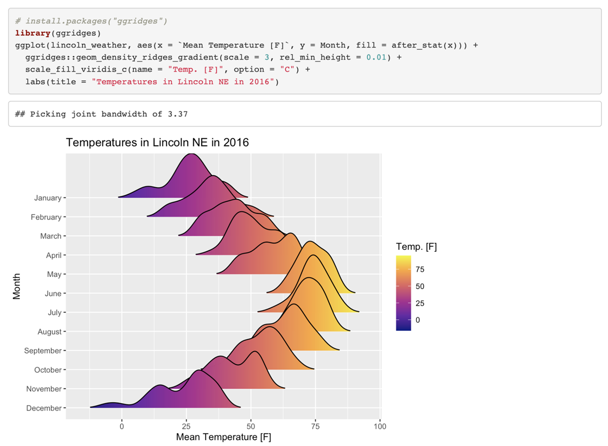 当然还有一个叫做ggridges的一个图,这个上面我们不仅仅看到可视化的效果,还可以直接把值标到上面。这样一个图给我们的信息量就非常大,当然在画图的时候我们不是单纯的追求这个信息量很大,我们要美观。要有足够的信息量同时也能够让大家不会一看到之后就不想看了,而是说看到之后能够立刻get到你想要传达一个什么样的想法,这个是很重要的。所以可视化这一点上面说实话我们即便在这个课上有两次课,但是我们只能教大家一些方法,大家最后画图的实际效果要依赖自己的taste,就是自己的一个口味和不断提升的感觉。