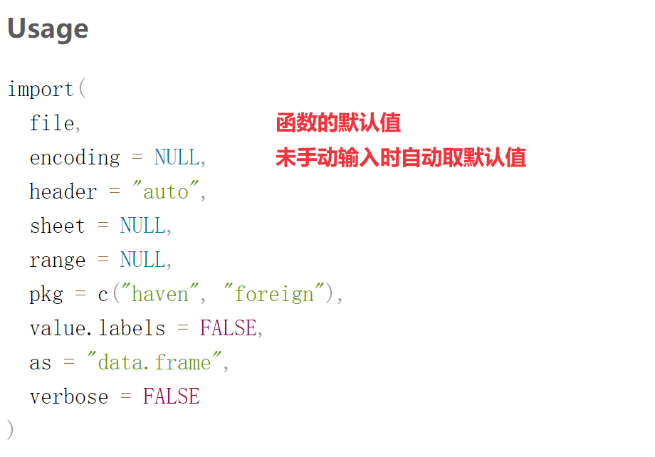 但在导入 penguin_data的例子中,还有个问题是,我们输入路径时,也并没有声明一定是输入给 file 参数,为什么函数“知道”我们想输入给谁呢?这是因为,在函数中,如果有多个参数的话,函数会默认按照输入的参数的顺序进行匹配,我们只输入了一个参数,因而会与 file 参数进行匹配。