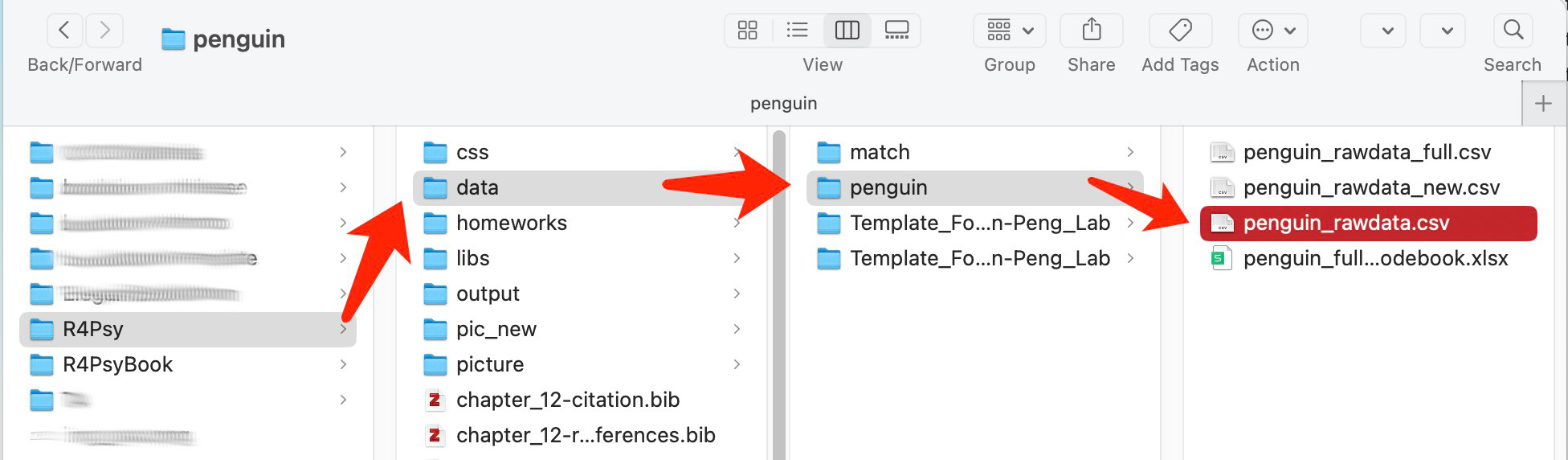 如果我们希望通过代码来导入数据,那么首先需要告诉电脑数据“住在”哪里(address),即到哪个文件夹来寻找数据。如果只是在文件夹中以点击的方式来寻找我们想要的数据,比要在 R4Psy 中找到名为 penguin_rawdata.csv 的数据,则需要按照以下步骤进行点击(以 Macos 系统为例):