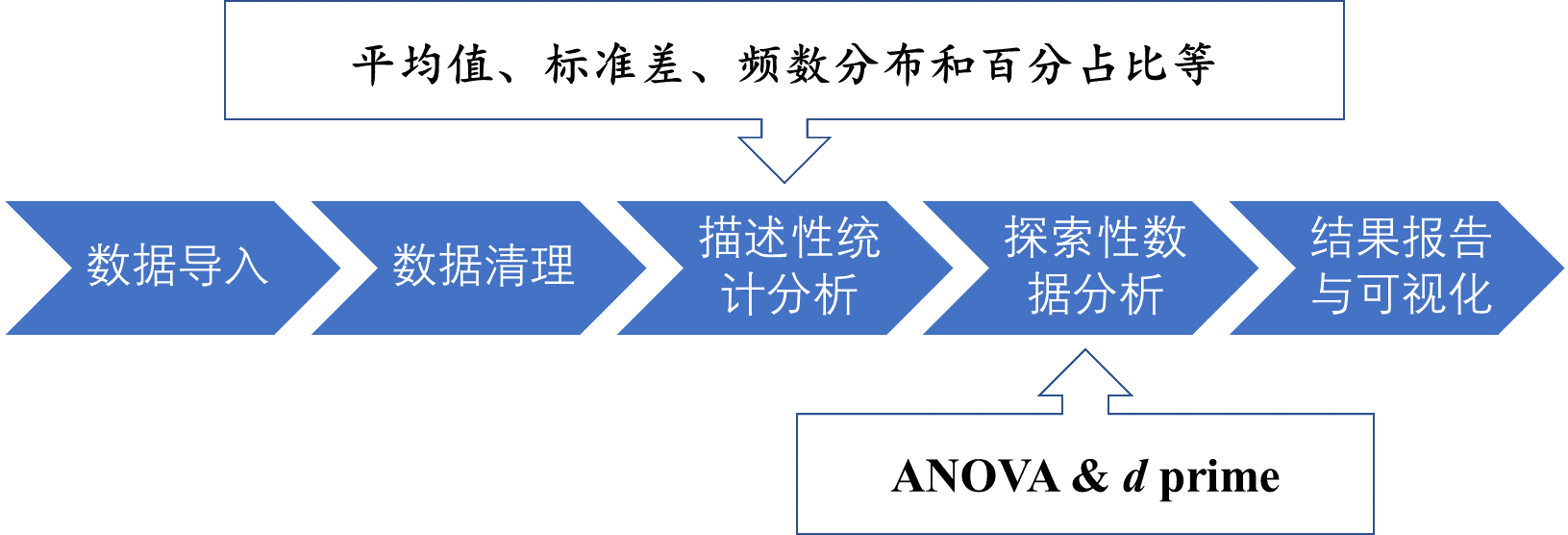 在认知实验中,我们进行数据分析的整体流程与问卷的数据分析基本上相同的:数据导入、数据清理、描述性统计。这时我们可能更加关注的是平均值,比如,每个被试在不同条件下反应时的平均值和标准差,以及频次分布或百分比等。我们也会进行一些常规的统计分析,比如重复测量的方差分析,计算出信号检测论下的敏感性指标(d’)。如果交互作用显著,我们还要进行简单效应分析。同样地,从数据的导入到分析,完整的流程均可以在R中完成。问题2的解决流程思路图如下: