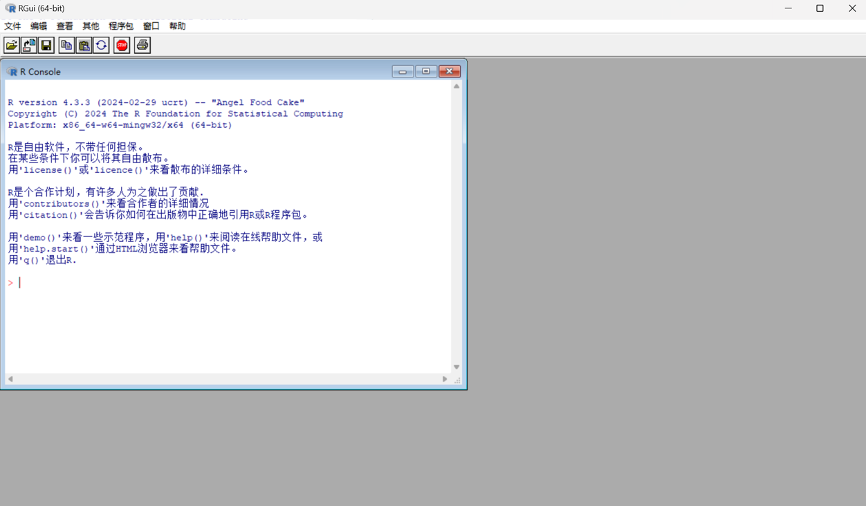 一般来说,现在大部分计算机都是64位比特的CPU,所以安装64位的R就足够了。安装时全部采用默认选择,安装完成后,你就可以看到下面这个界面。安装时我会选择默认的安装路径,同时确保路径中没有中文名称。完成后,我们会看到R的Logo,点击它就可以打开R的界面。