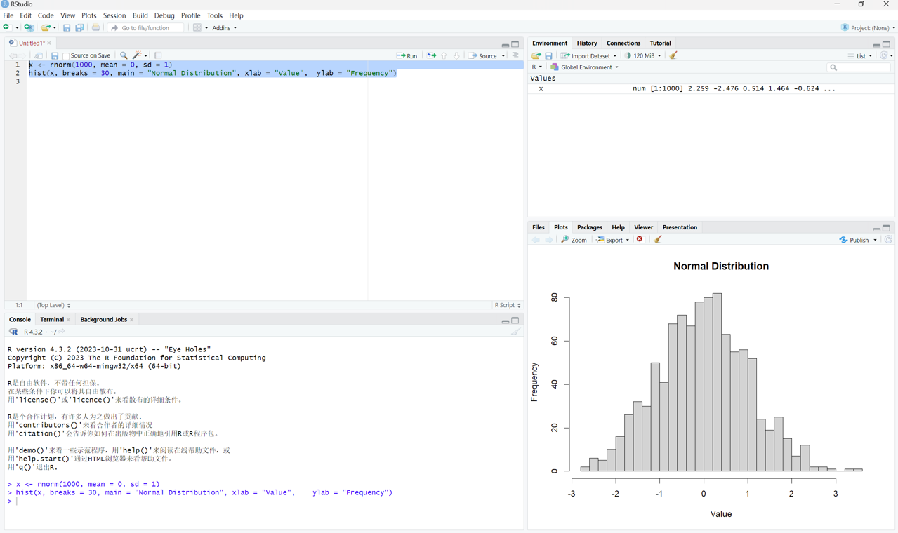 运行完之后可以看到右上角的environment多了一个x,有一千多个变量。这样可以看到左上角是写代码,左下角是交互结果——即左上角代码运行的结果,右上角是运行之后临时变量和数据的存放,右下角是输出的结果——图表展示。如果Rstudio安装配置成功,运行上面的函数命令后你将同样生成一个随机的正态数组,并且结果将显示在相同的地方。如下: