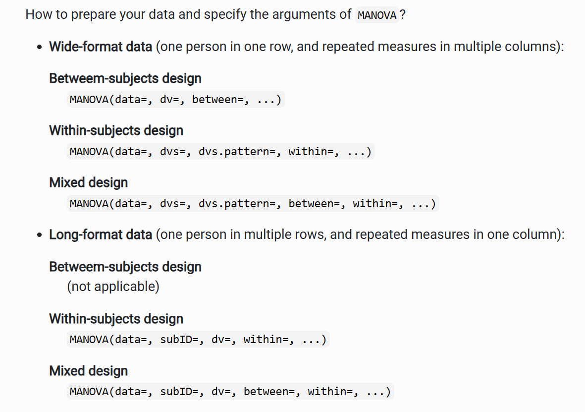 在实际研究中,即使我们知道ANOVA与线性回归有相似之处,但我们仍然需要报告传统的方差分析结果。在这种情况下,我们推荐使用bruceR包的MANOVA函数,它是一个非常强大的函数,基本上涵盖了我们在心理学中常用的所有ANOVA类型。使用MANOVA函数可以大大简化心理学研究者使用这个方法的门槛。