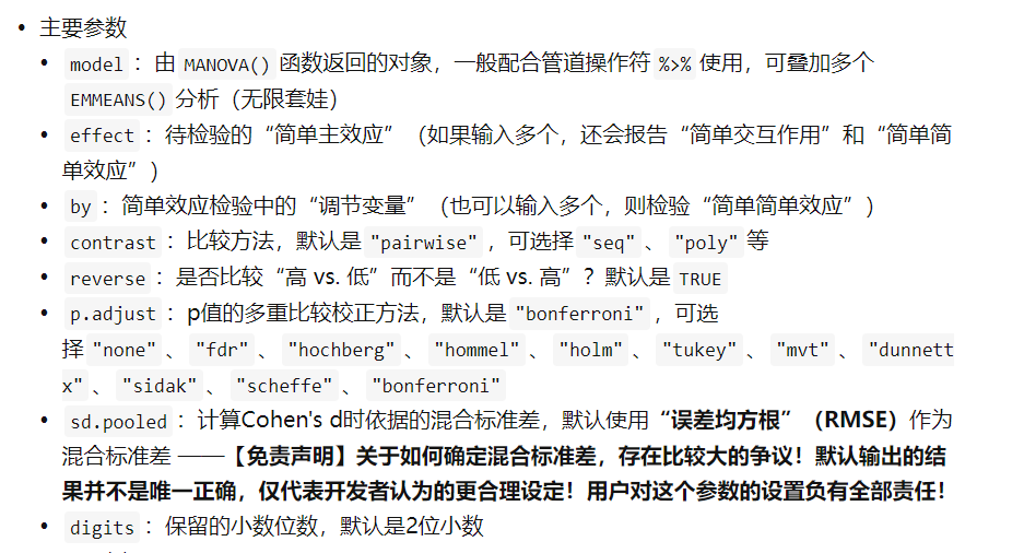 与SPSS不同之处在于MANOVA函数会输出Generalized Eta Squared(广义η²),这是方差分析的一个效应量指标,有助于我们更好地理解结果。关于效应量的指标,对于传统心理学来说,我们通常只关注p值。但实际上,最近的趋势是大家会更加关注效应量有多大,而不仅仅是p值是否显著。换句话说,我们不仅关心结果是否显著,还关心效应量是否足够大。