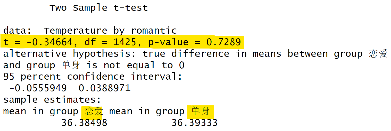 ## [6] "alternative hypothesis: true difference in means between group 恋爱 and group 单身 is not equal to 0"