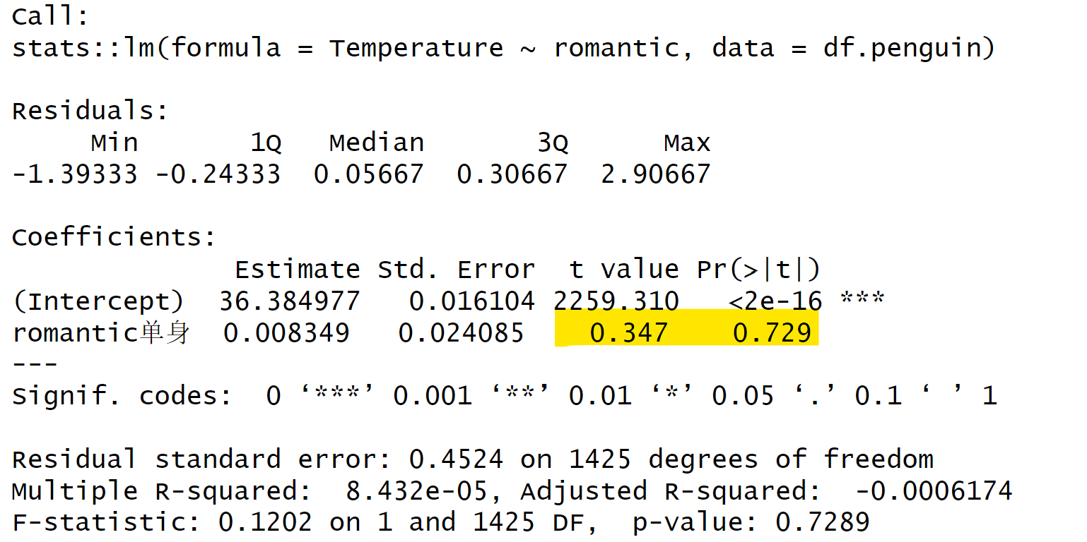 Temperature ~ romantic, # 因变量~自变量