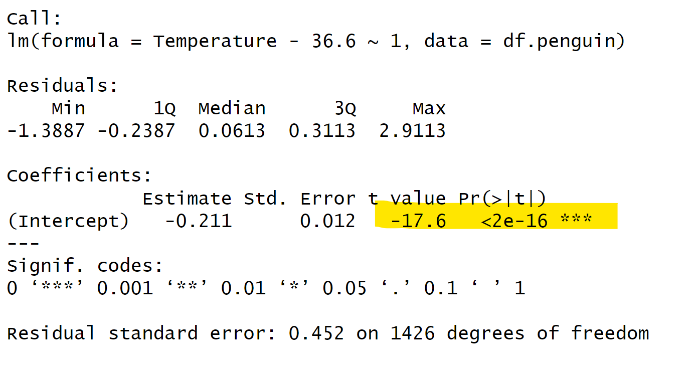 当我们进行单样本t检验时,我们需要稍微调整公式。我们将因变量(temperature)减去我们想要比较的特定值(例如30),然后考虑减去特定值后的因变量均值是否属于一个以0为均值的正态分布。在这个回归模型中,我们加入一个截距项,用于进行t检验。