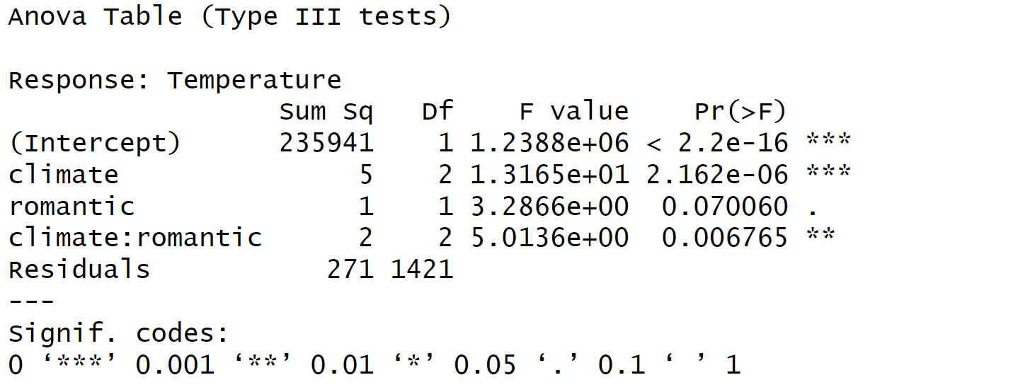 afex::aov_car(Temperature ~ climate * romantic + Error(subjID), data = df, type = 3)## Contrasts set to contr.sum for the following variables: climate, romantic