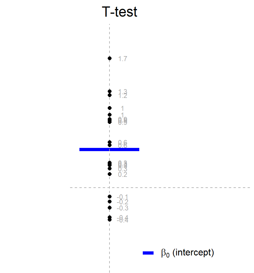 \[y = \beta_0\] \[H_0: \beta_0 = 0\] 如图所示,这里有一群点,我们想要比较的是这些点的均值(例如用菱形表示)与某条线(特定值)之间是否存在显著性差异,或者说这些点的均值与这条线是否来自同一个总体。在这种情况下,我们可以构建一个只包含截距项β0的回归模型,即y = β0。我们也可以使用回归模型进行统计检验。