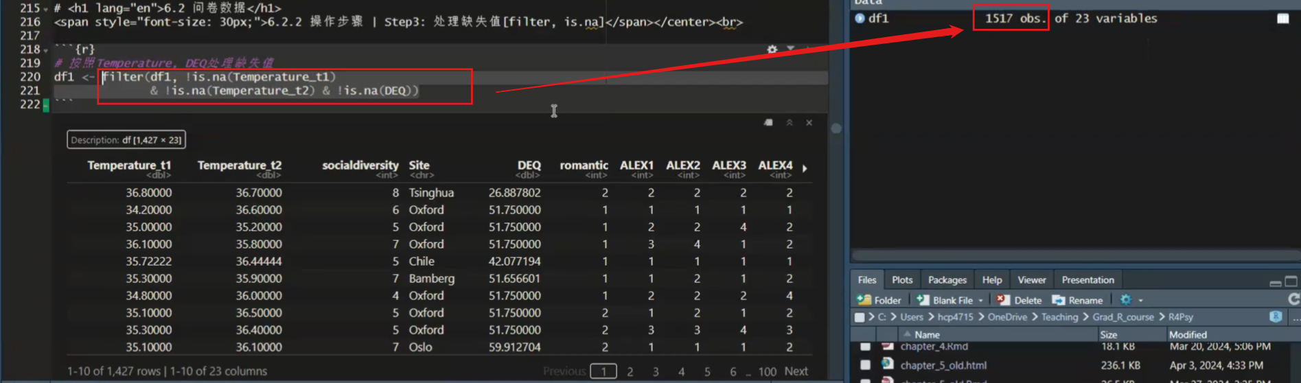 RT >= 0.2 & RT <= 1.5) # 选择RT属于[200,1500]当然选择变量,然后处理这个缺失值,用filter,然后这里有一个tidyr里面的有一个很好用的一个函数叫做drop_na,用的时候要谨慎一点,因为它是一个比较粗暴的方法,就是把任何一行只要它有缺失值的话就直接给扔掉了。那么有的时候你可能知道,就比方说某一个数据里面,只要他任何一行里面有一个缺失值,那个数据你就完全你知道你不会用了。那你就可以用drop_na,要不然的话这个会丢掉太多的数据。这个好用,但是要谨慎的使用。