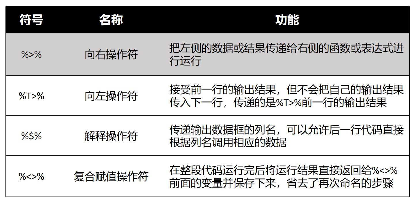 Tidyverse常见的管道符如表所示(依赖于magrittr包):