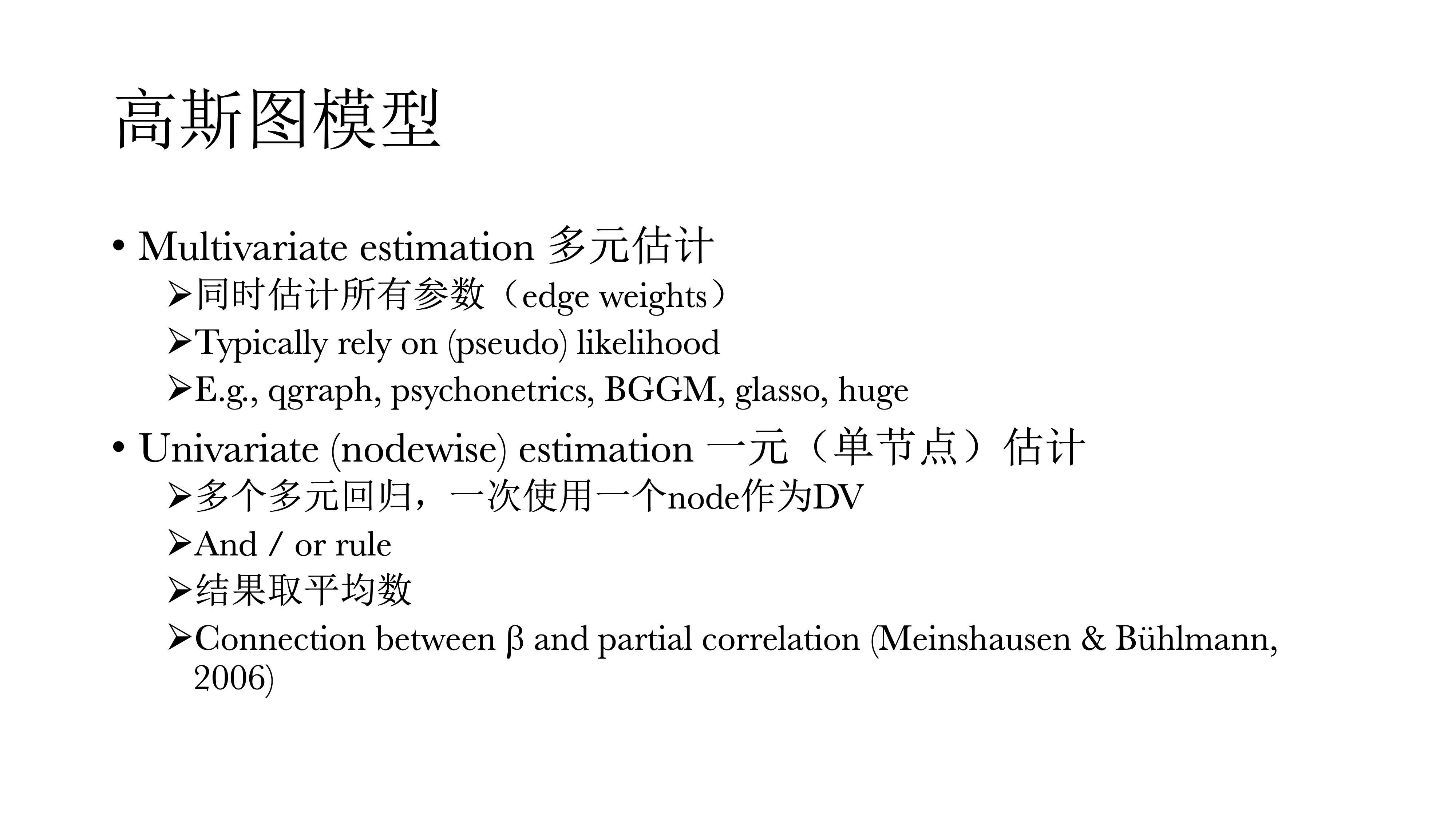 对于高斯图模型,有两种估计方式,多元估计与医院估计。 在网络中,一个一个的圈圈叫做节点,他们之间的相关或关系叫做连边。如果一次性将网络中所有的点和边都估计出来,叫做多元估计(Multivariate estimation),通常使用最大似然法。 如果一个一个的估计,即使用多个多元回归,一次使用一个节点作为因变量,其他所有节点作为自变量,最后对结果取平均数,即一元估计(Univariate estiamtion)。