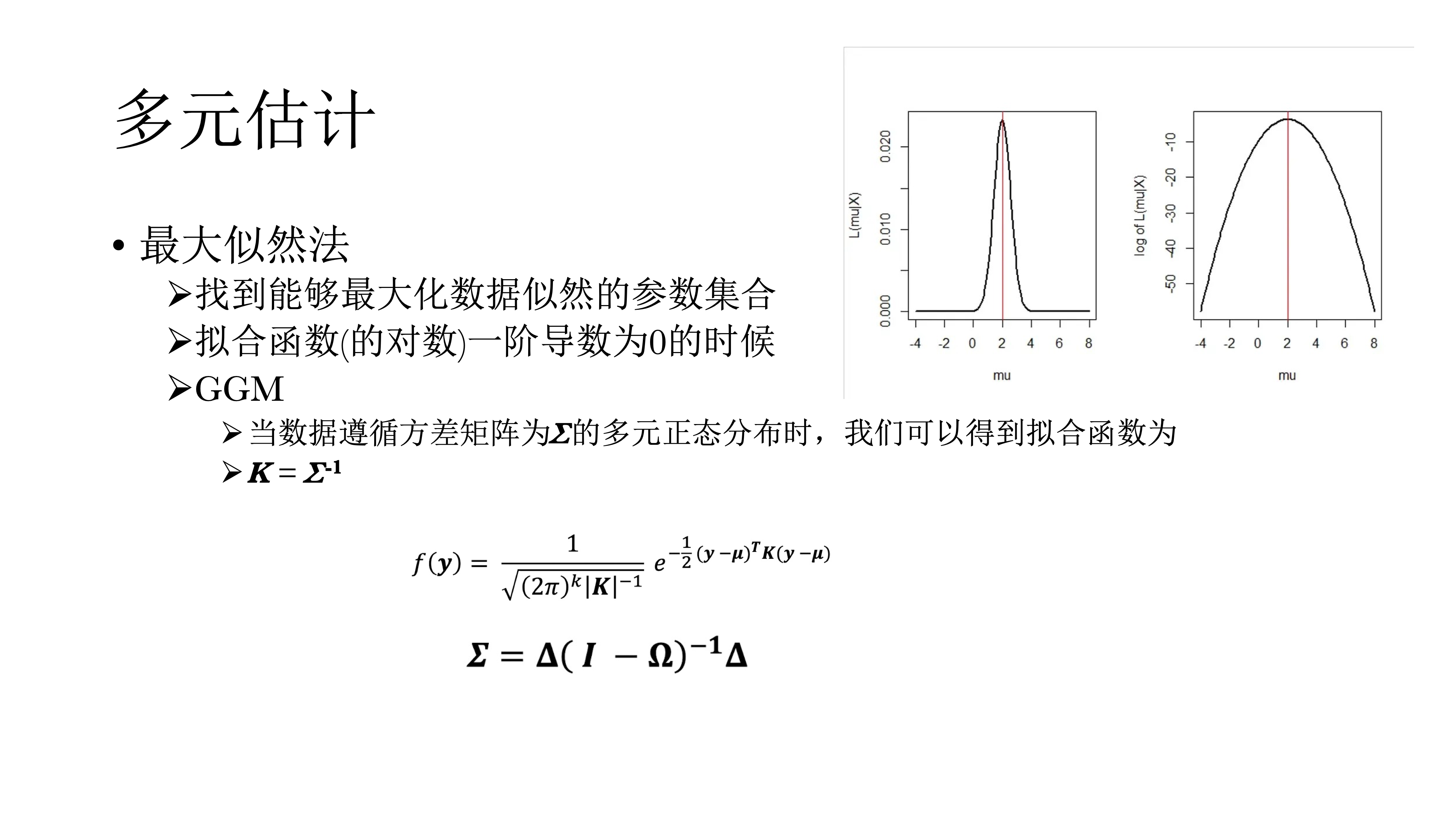 对于多元估计,一种方法是最大似然法。最大似然法简单来说,就是尝试各种参数的组合,看哪个参数组合能与数据相匹配的概率。似然可以用方程表示,最大似然即寻找方程的最大值(计算一阶导并等于0求解)。当数据遵循方差矩阵为∑的多元正态分布时,拟合函数如下图。
