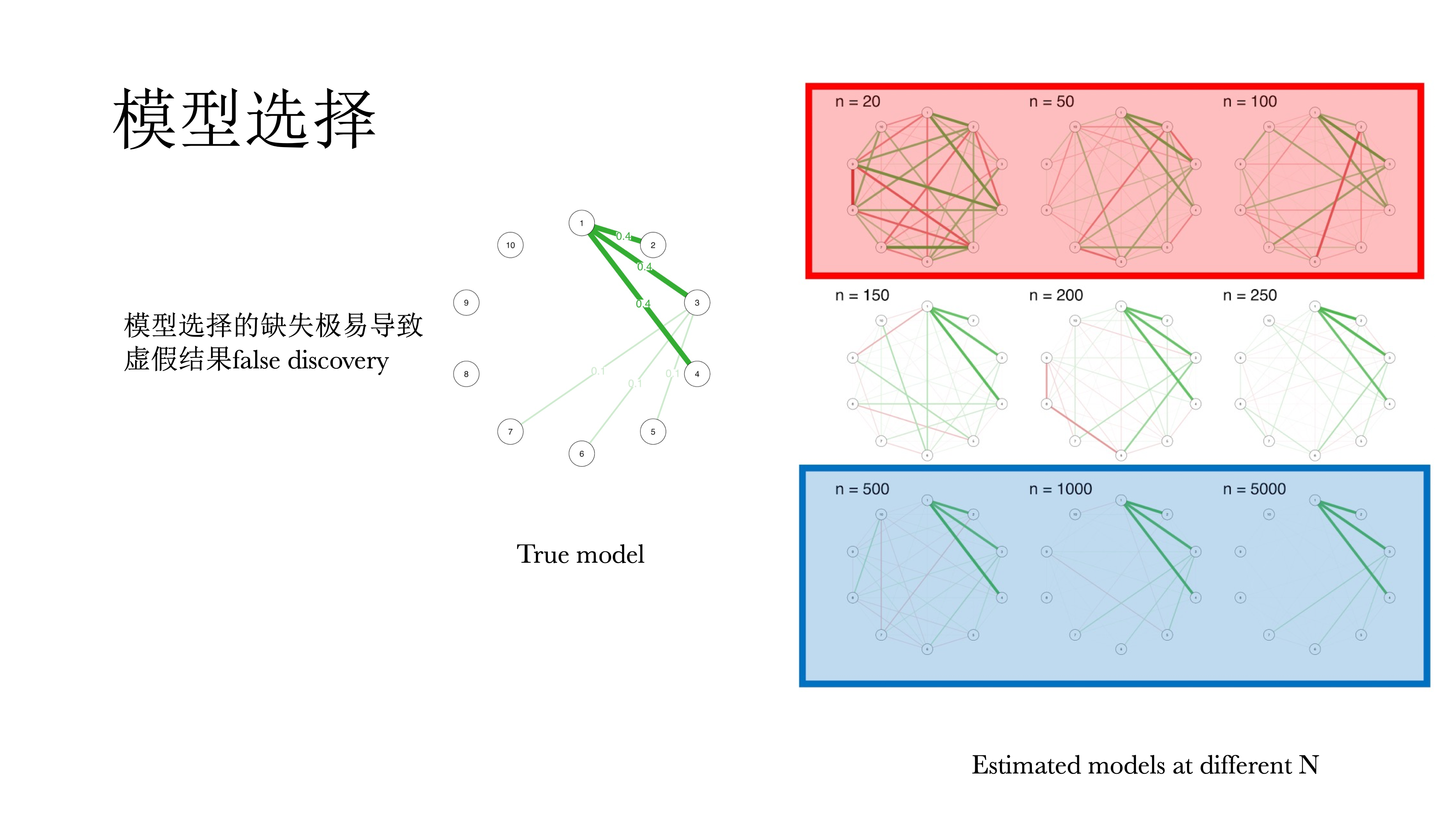正则法就是在最大似然里惩罚模型复杂度,好处也是比较快,但它是适合小样本的,结果更容易解释。但缺点是它的估计永远是有偏的,这是正则估计的特性,因为他的表现不规律,它最后估计的期望不一定是真值。但在网络中,我们不解释连结的weight(表现为连边的粗细),仅说明是正连边还是负连边。