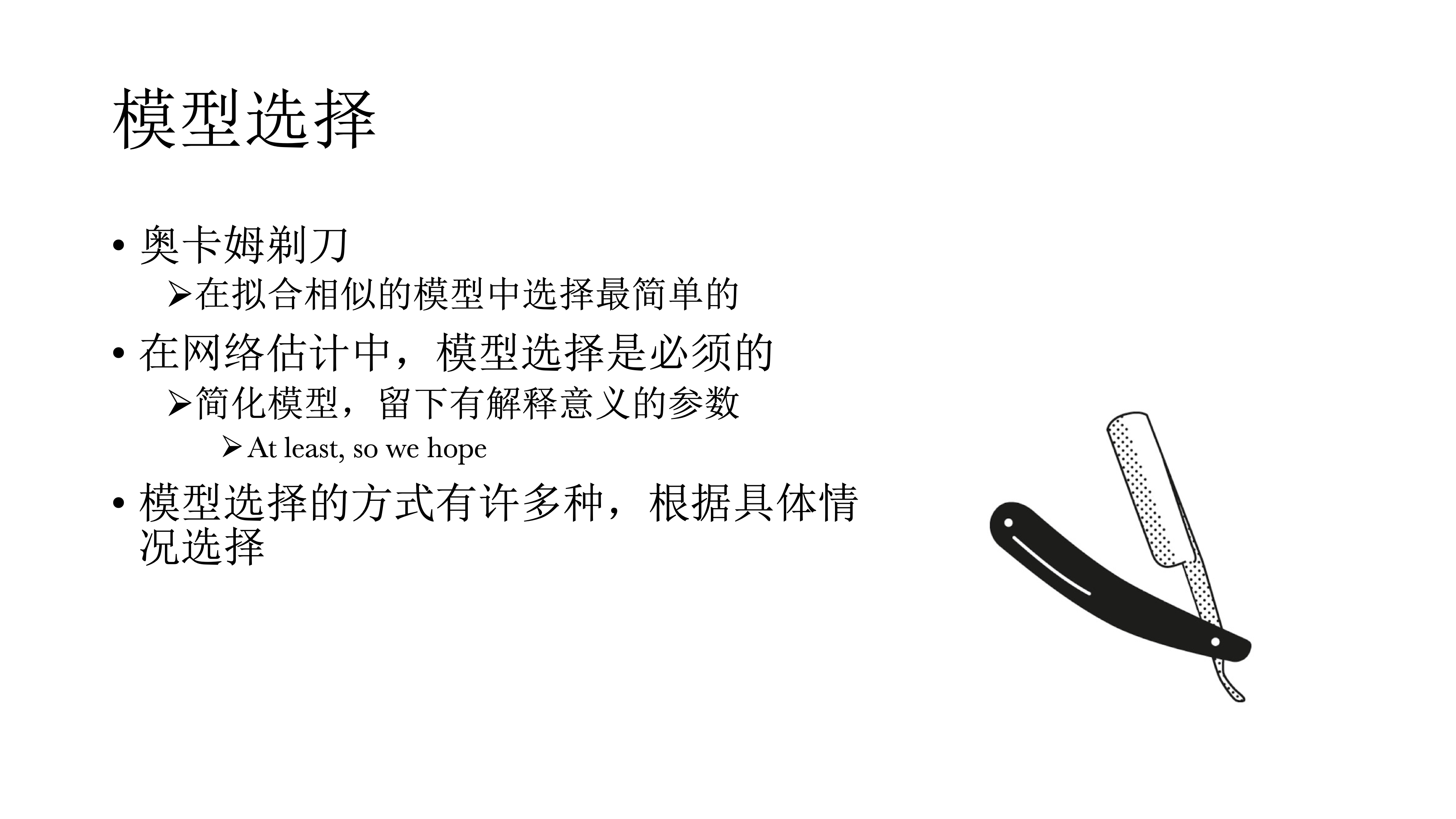 在模型选择中有一个原则称为奥卡姆剃刀,即在拟合相似模型中选择最简单的,因为其推广性最好,也容易解释。在网络模型中基本上都要去做模型选择来简化模型,留下有解释意义的参数。