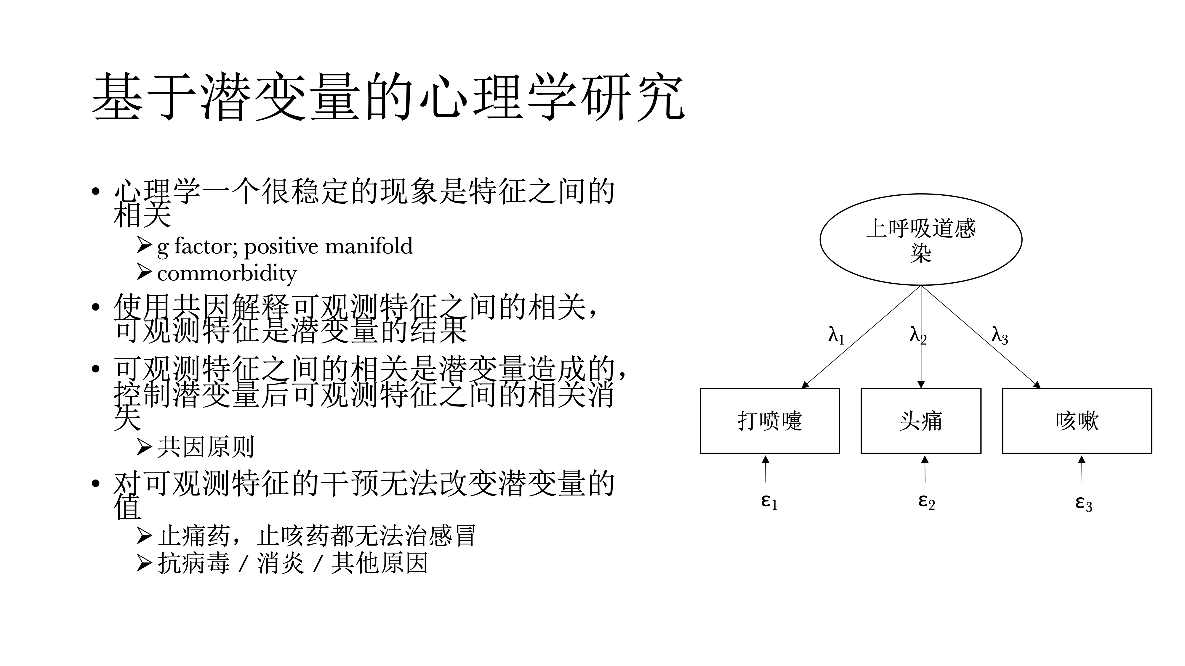 首先,心理学有一个稳定的现象,什么东西之间都有相关的。比如,在智力的研究中,有一个非常稳定的现象positive manifold,是在探讨,测量智力的所有东西,哪怕测量的是不同的东西,比如测量数学能力、英语能力,他们之间也会有正相关,而且这个正相关非常普遍,他们也是在解释这些潜变量,低阶的潜变量之后还会发现一些没有被解释的变异,因而就提出了一个潜变量模型,就是g factor model。