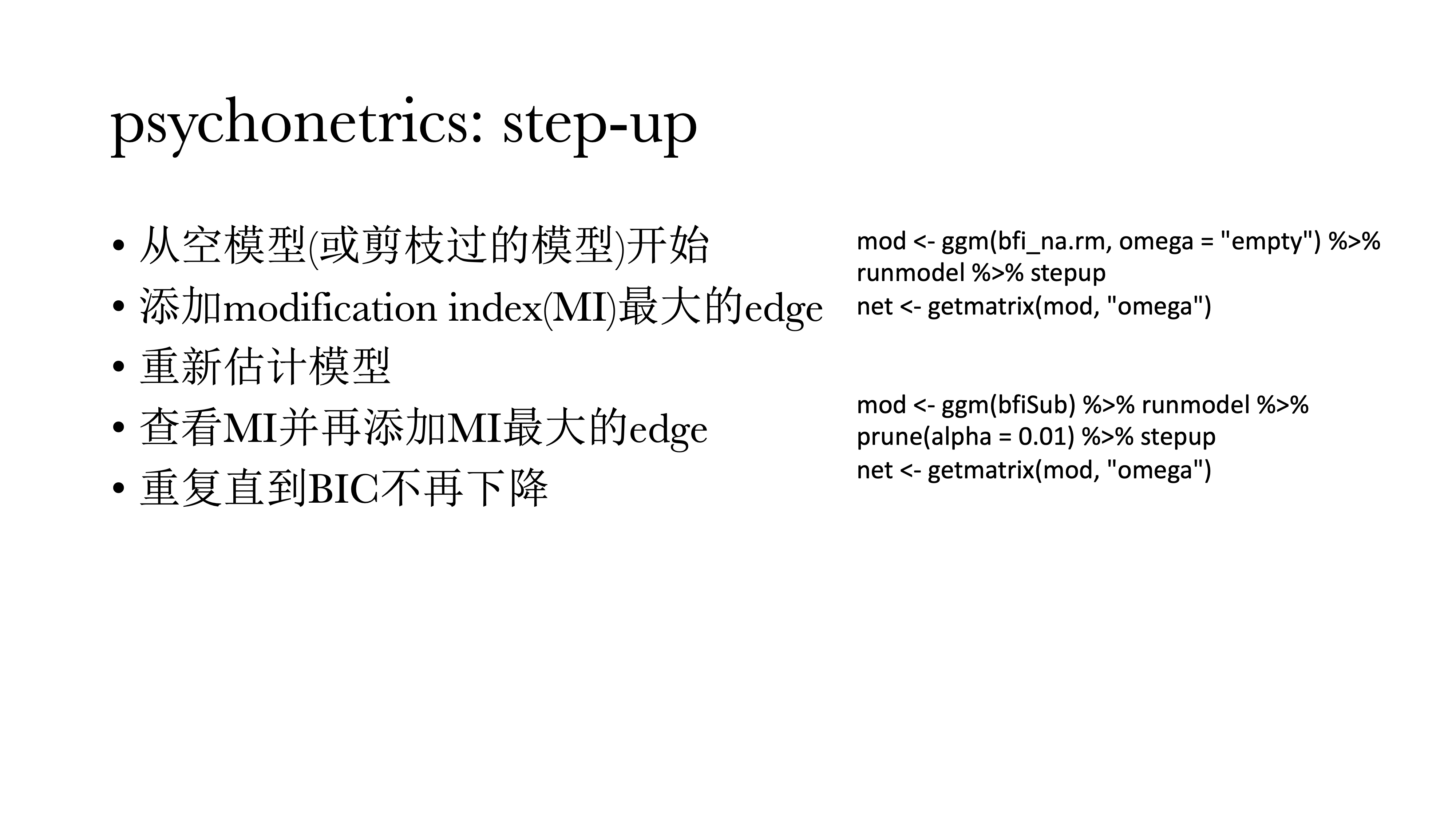 总而言之,小样本使用正则法,大样本使用模型搜索。Isvoranu和Epskamp(2023)的文章中有对样本大小的说明,以及其他更全面的解释。
