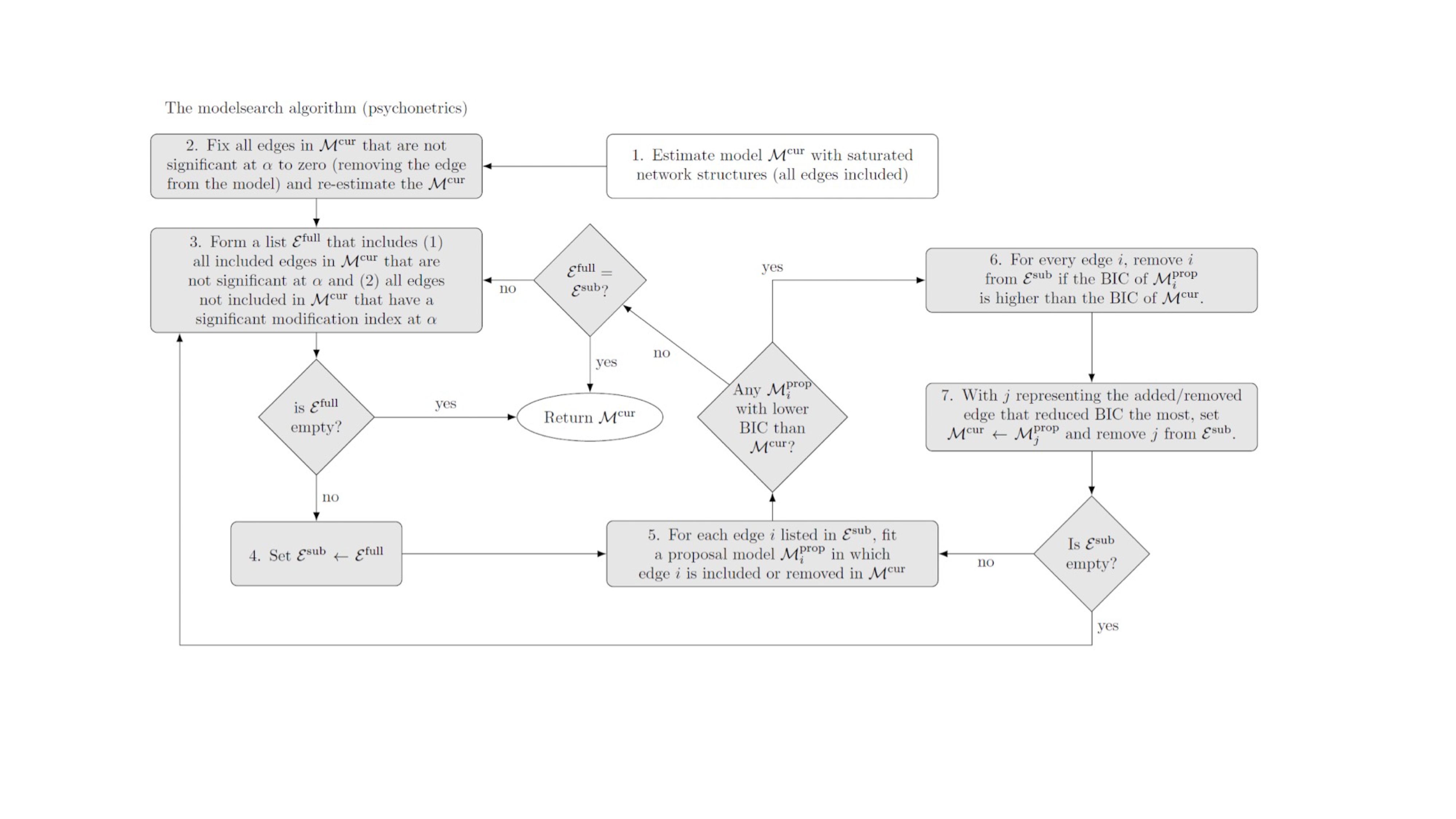 模型搜索的方法应该是最好的方法,但也是最慢的。其逻辑是使用不带正则的最大似然估计不停调整并重新估计模型,直到选择最优解。比如简单的step-up方法,如下图所示,首先从空模型开始,然后加一个modification index(结构方程模型中的调整系数),每次把调整系数最大的连接给加上,然后再重新估算一次模型,并且比较模型拟合是否有提升;然后再在新的模型中找到新的调整系数,再计算、比较模型,直到模型拟合不再提升。