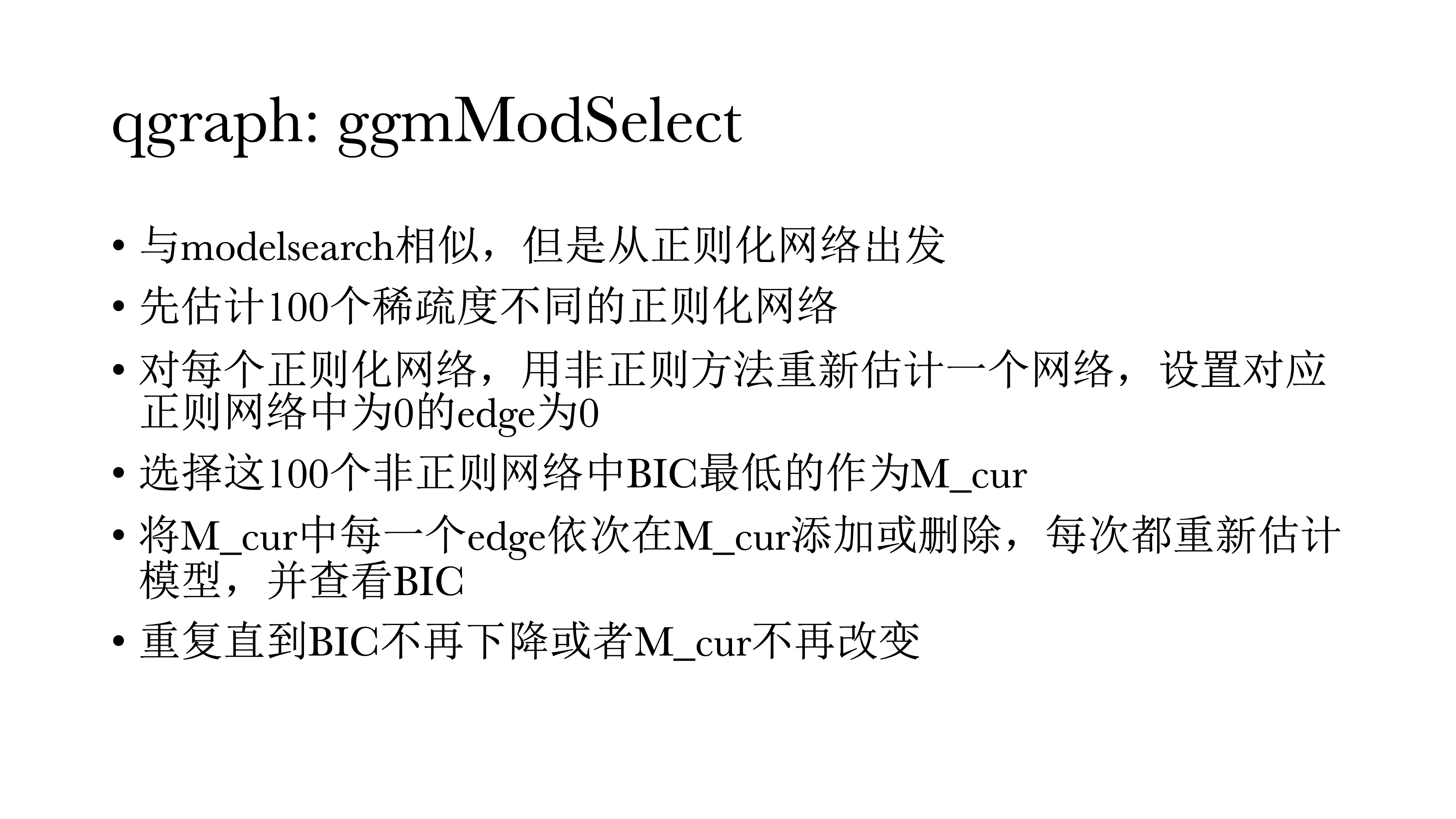 模型搜索,使用反复的方式来优化指标,一个个搜索反复添加、删除,直到找到最优的模型。好处是同时照顾power与假阳性的概率,是一个无偏估计。因为模型搜索检查的模型更多,所以它更可能converge到真模型。坏处是,速度很慢,在小样本中表现不好。