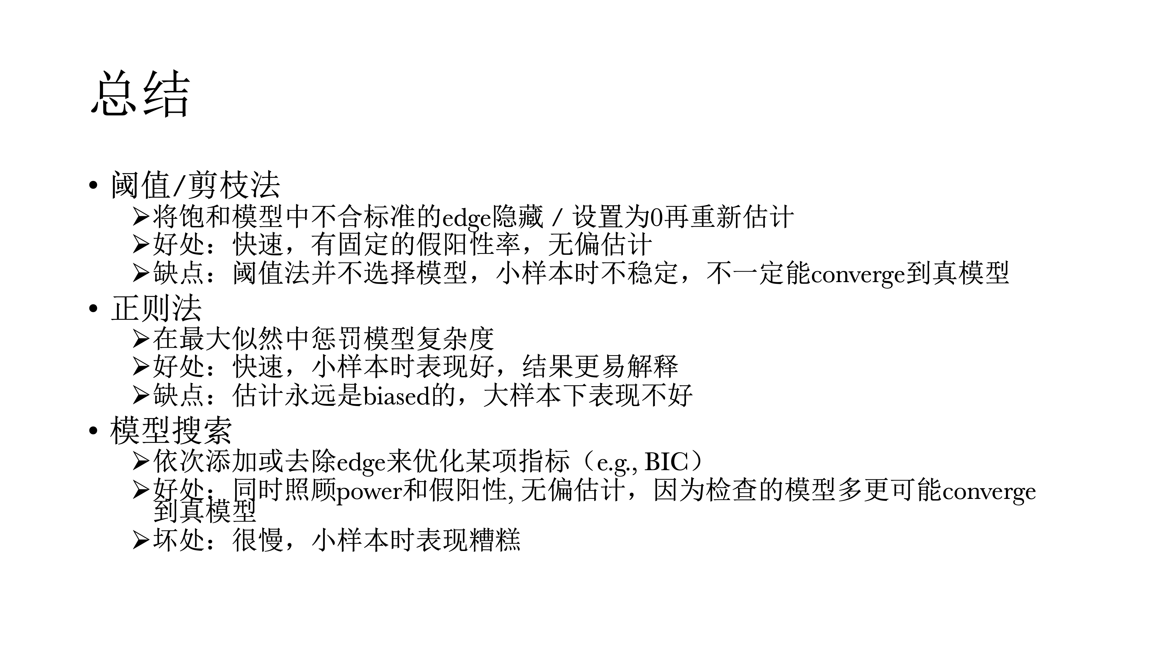 阈值和剪枝法就是将饱和模型里不合标准的连结给隐藏起来,或者是设置为0再重新估计。好处是速度快,拥有固定的假阳性率,同时是一个无偏估计。但缺点是它并不选择模型,在小样本中表现不好,尤其在小样本的时候可能发现不了真模型。