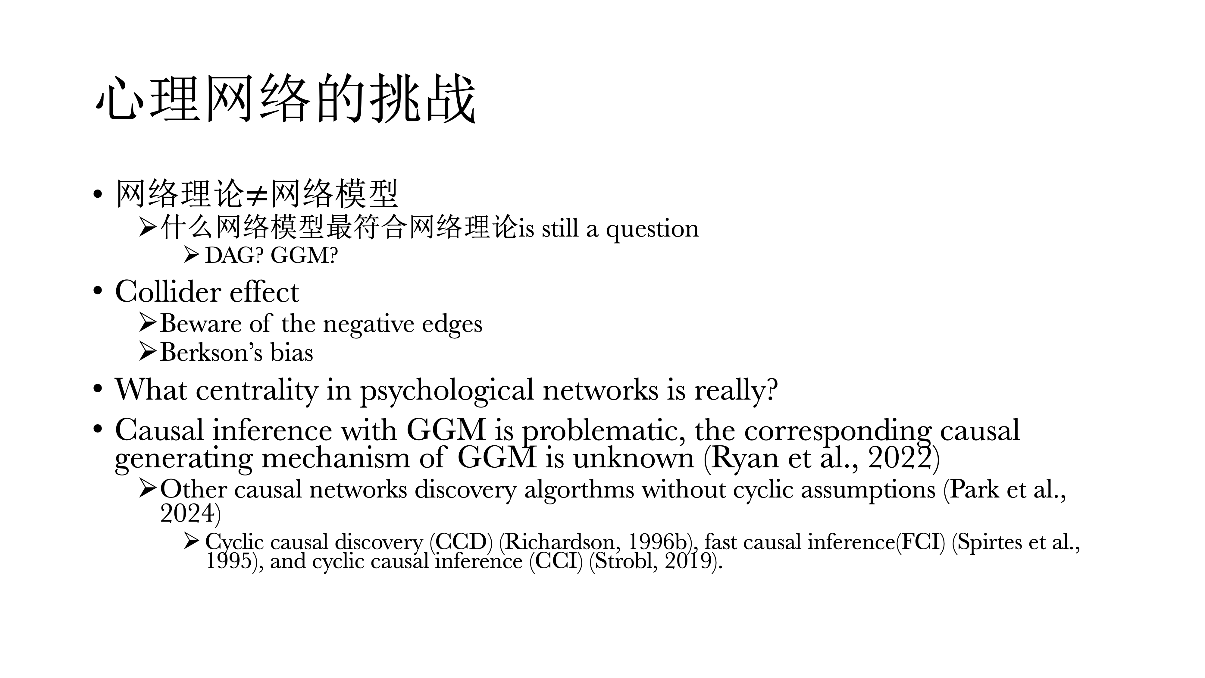 首先,网络理论不等于网络模型,心理学理论和模型之间的关系也有很多值得讨论的。DAG与GGM,二者谁才是最符合网络理论的网络模型?还是近期的新模型,一种有向有环的模型,它可能更好的符合网络理论的统计模型。
