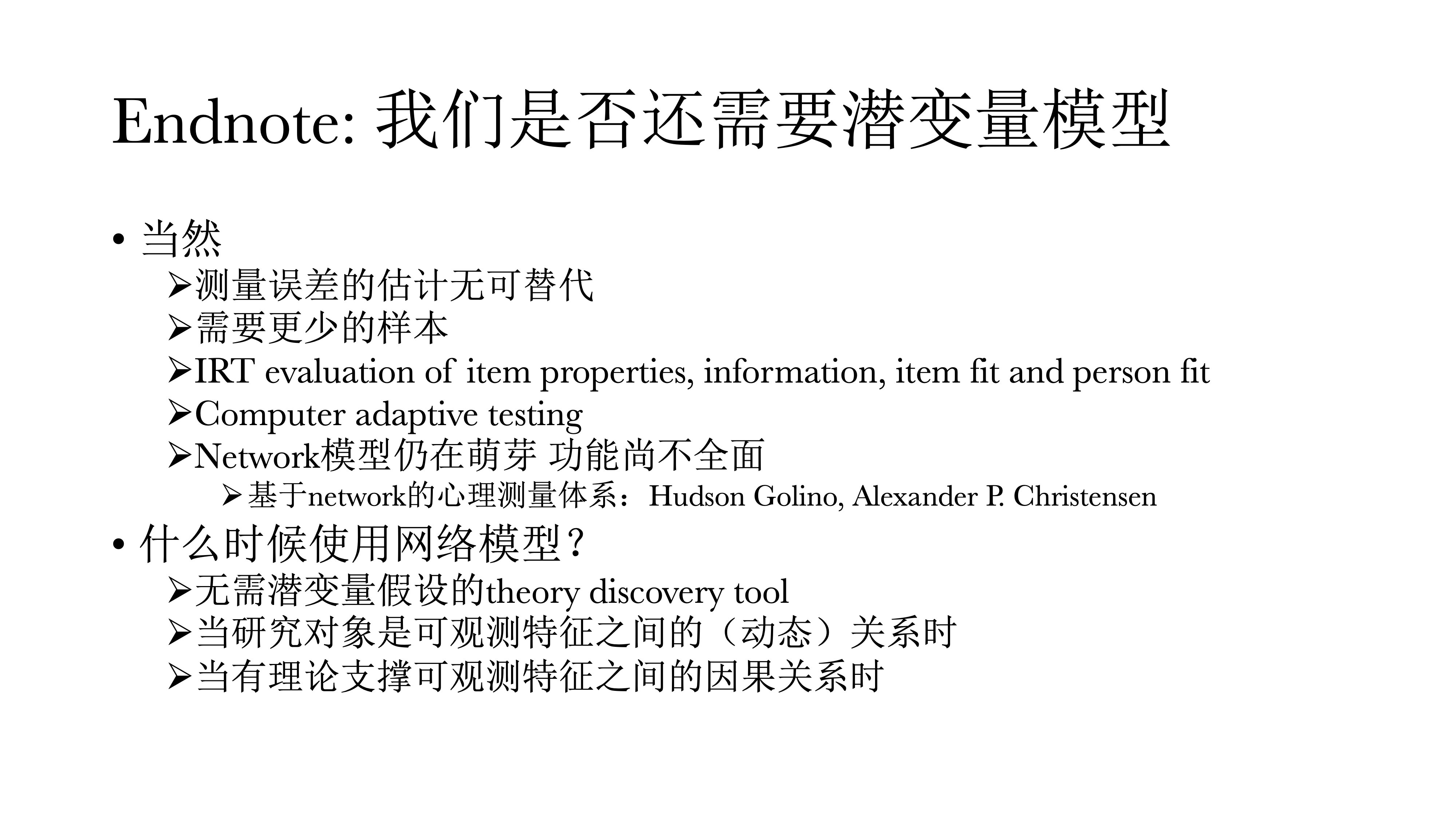 基于Network的心理测量其实也不是很全面,大家可以看看下面两个人的文章(见下图)——基于网络的心理测量应该怎么做,定义是什么样,其实都不太一样。基于网络模型的量表,跟基于潜变量模型的量表也不太一样。