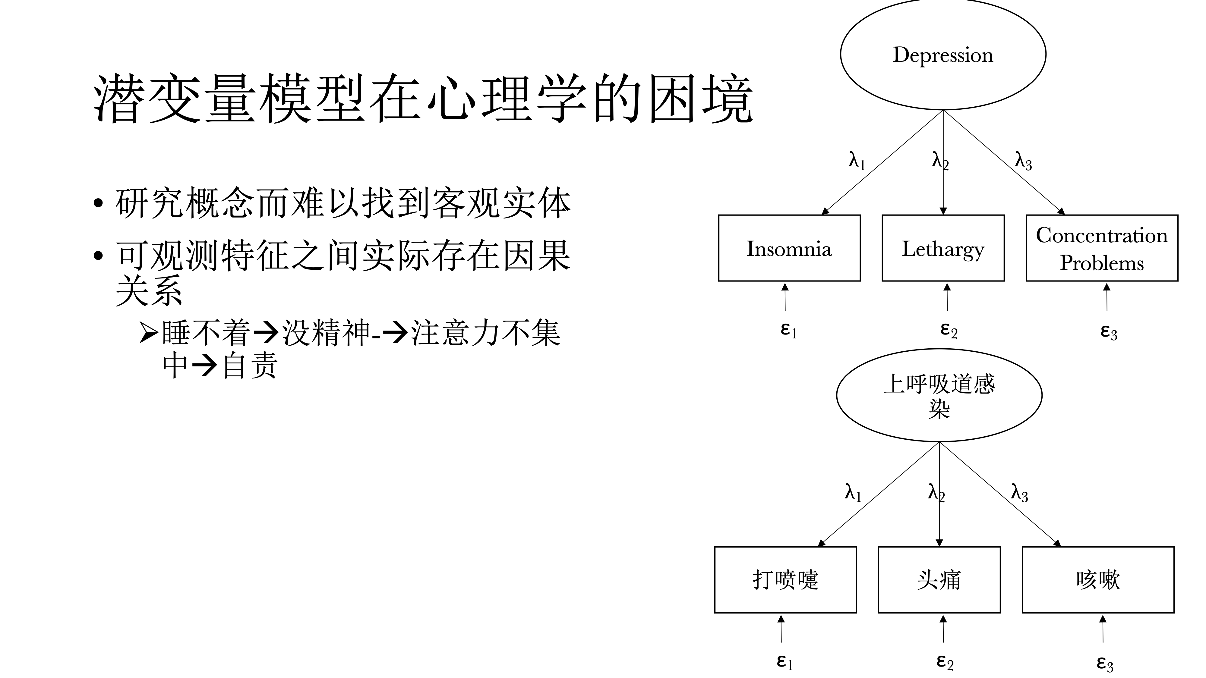潜变量模型在心理学研究中的困境是,心理学研究对象往往是概念,比如人格等,如果依据潜变量定义的话,他们是看不见摸不到的。