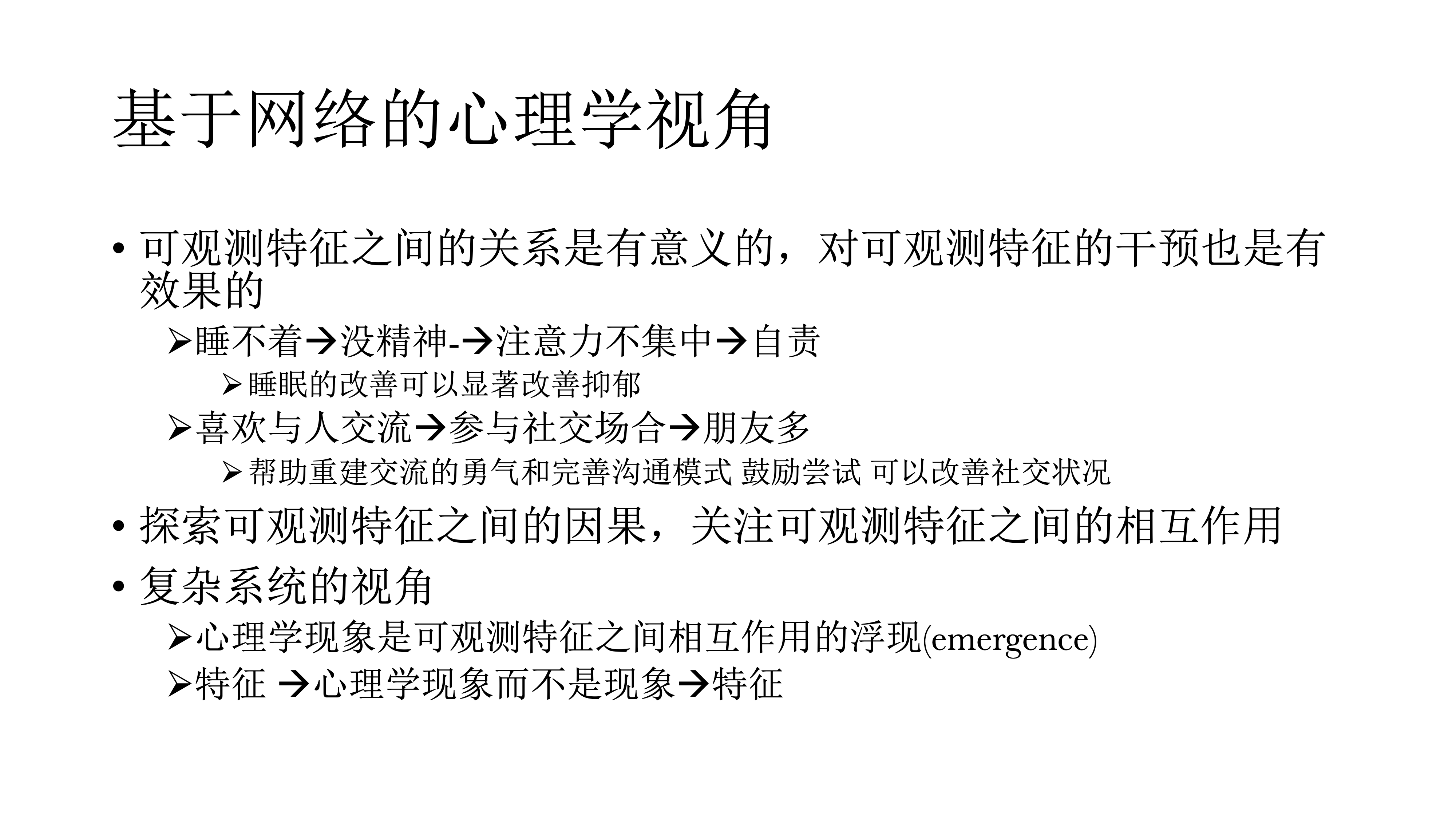 所以,基于网络的心理学视角,会更着眼于可观测的问题,然后探索他们之间的因果,关注可观测特征之间的相互作用。网络分析中可观测特征和心理学概念之间的关系与潜变量是相反的:潜变量的因果方向是从潜变量到可观测的特征,但是在网络分析的视角中,则是可观测变量间相互作用,然后浮现、上升到具体的心理学现象。