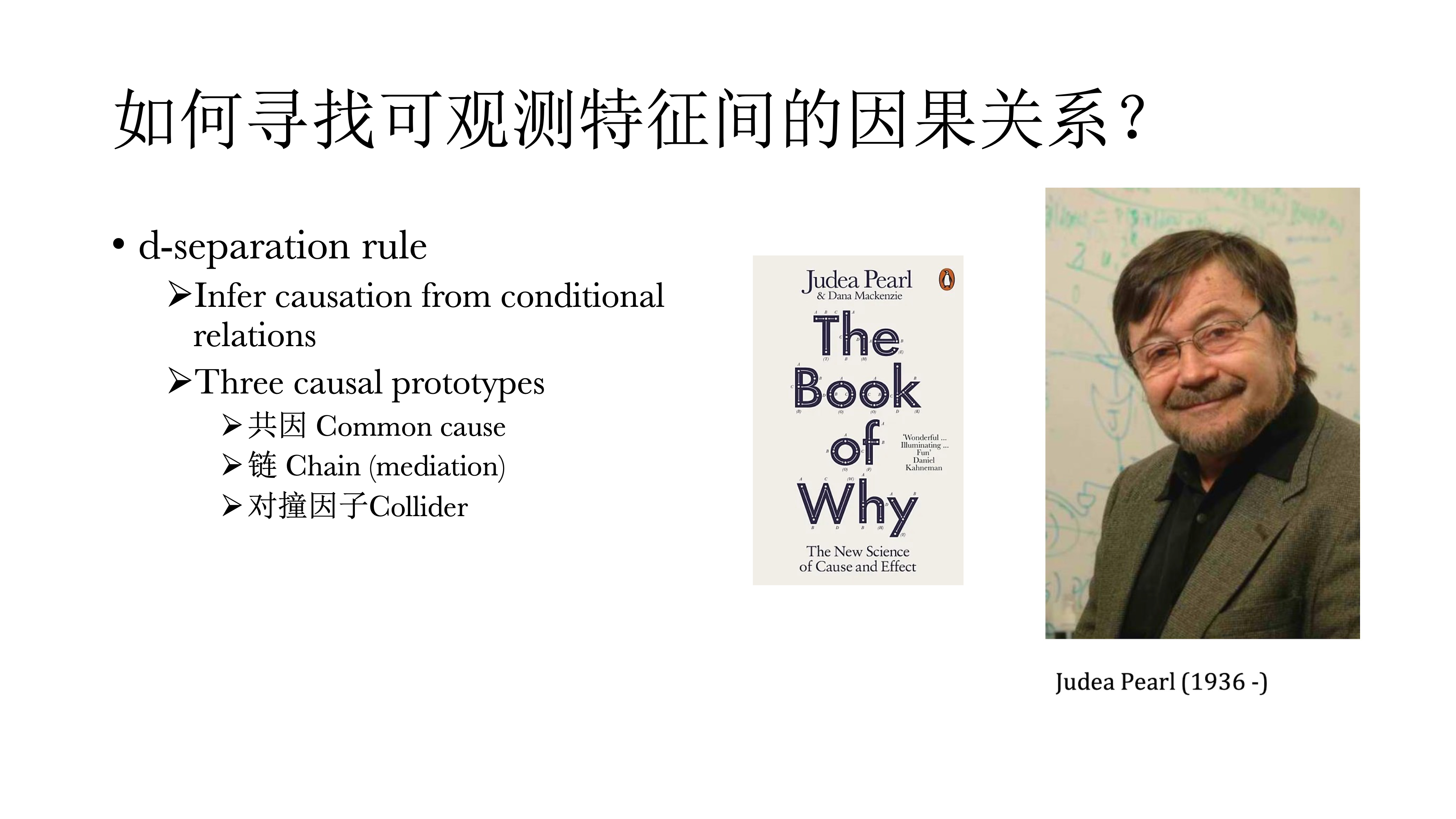那么我们如何寻找可观测特征之间的因果关系呢?这方面的研究则要归功于Judea Pearl,他做了非常多的有关因果推断的工作,发现我们可以从变量之间的偏相关中推断变量间因果关系,这个方法被称为d-separation rule。并且,他发现了三种原始因果图示,所有的偏相关来推断因果都可以归结为三种基本的图式(共因、链、对撞因子)。