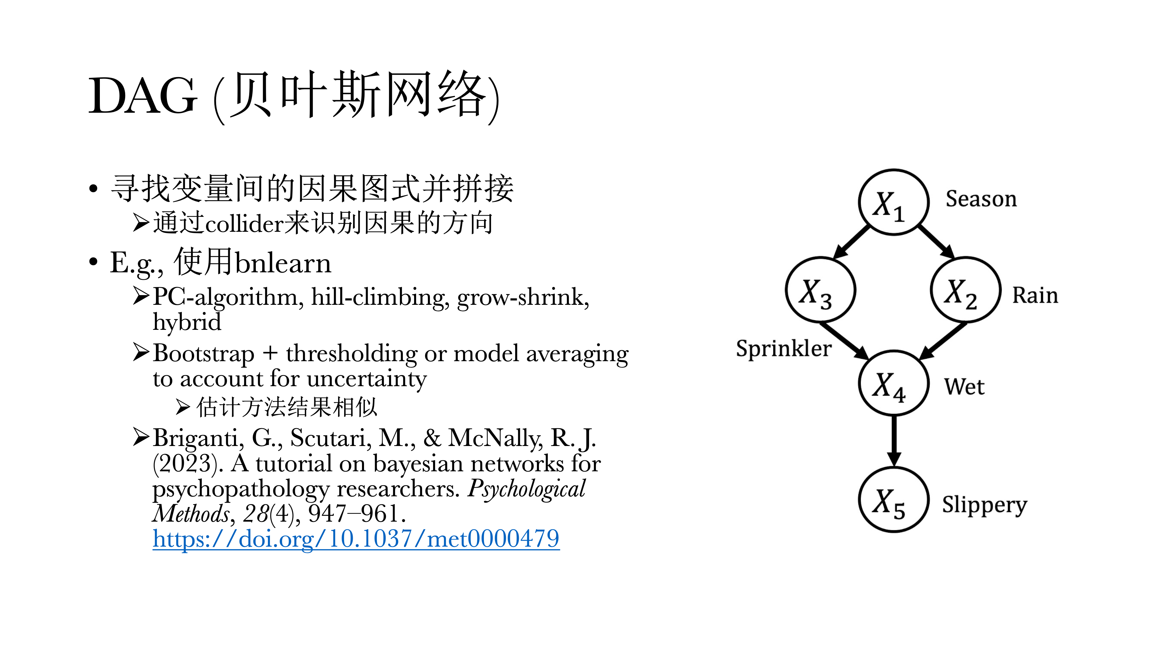 贝叶斯网络除了等价模型的问题,还有一个无环假设,因为如果在模型中引入双向因果,则模型无法识别,必须无环假设来对模型进行估计。但这是一个强假设,在心理学中正反馈与负反馈是非常常见的,这也对探索性研究非常不利。刚才提到,由于只能通过collider来确定因果方向,其他图示无法判断。并且如果模型中的节点越多,其等价模型也就越多,几乎没有办法进行判断应选择哪个模型