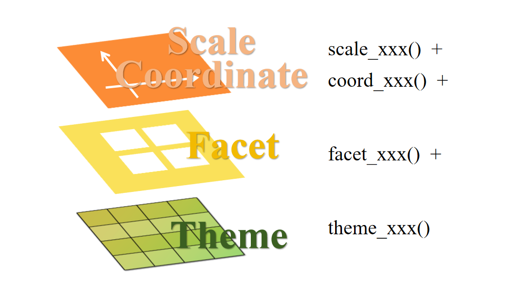 这些问题需要我们加入额外的图层来加以解决,这就是可选图层。例如我们可以用scale_xxx()函数自定义坐标轴的一些信息,用theme_xxx()函数来切换图片的主题。
