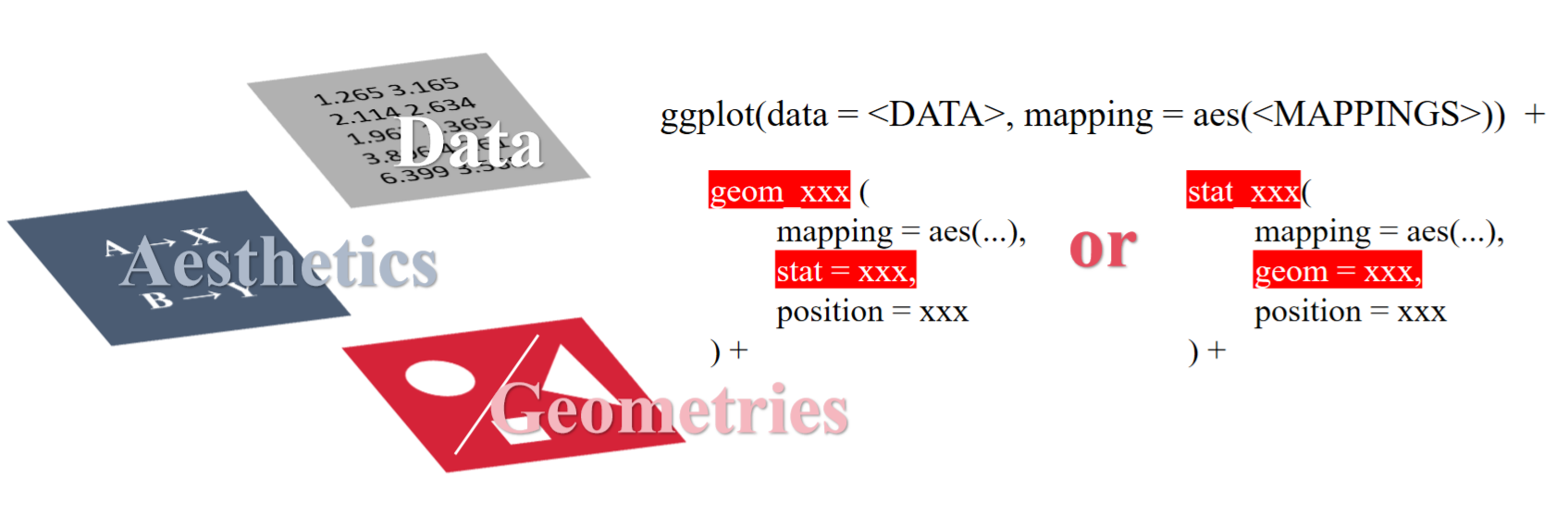 ggplot2的图层叠加主要分为分为主要图层和可选图层。主要图层主要包含了数据(data),映射(aesthetics)和图形(geometries)。在代码中,便是如下图所示的,首先放入数据data,然后我们需要对数据建立空间上的映射(MAPPINGS),最后再决定用什么样的几何图形对映射的数据进行可视化,也就是图中红色的部分,这些红色的图形又通过加号进行叠加。这就是基础的主要图层。