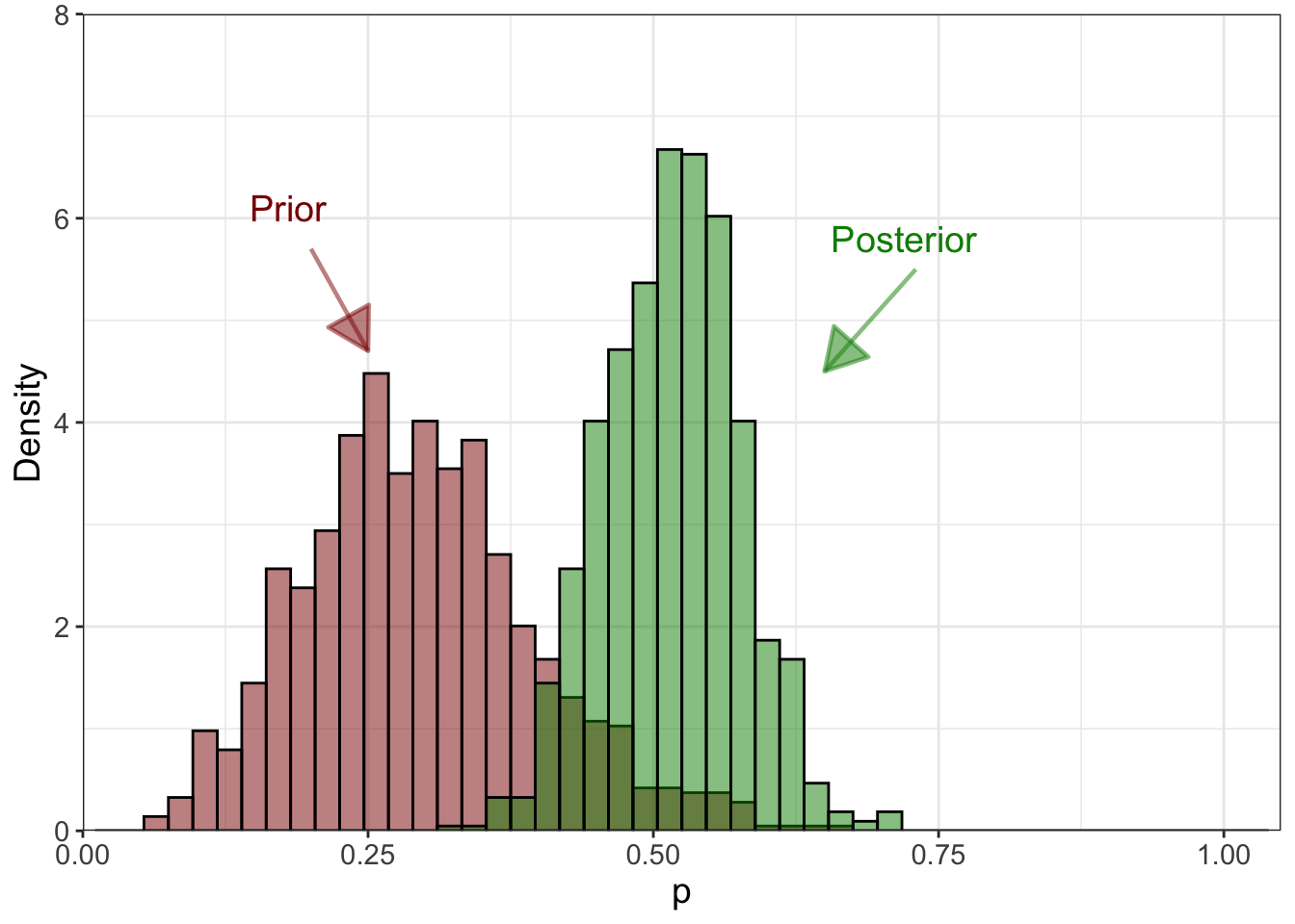 - Posterior: \[[p|y] \propto binomial \boldsymbol{\cdot} beta\]