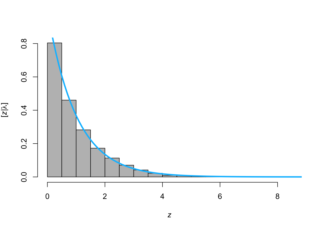 z <- rexp(n = 10000, lambda = 1) hist(z,freq=FALSE,col="grey",main = "", xlab= TeX('$\\mathit{z}$'), ylab = TeX('$\\lbrack\\mathit{z}|\\lambda\\rbrack$')) curve(expr = dexp(z = x,lambda = 1), from = 0, to = 10, add = TRUE,col = "deepskyblue",lwd = 3)