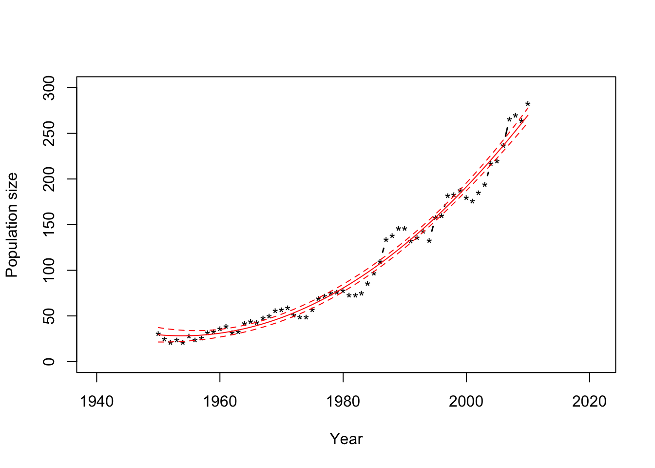 ## fit lwr upr ## 1 29.35980 21.43774 37.28186 ## 2 28.84122 21.42928 36.25315 ## 3 28.47610 21.54645 35.40575 ## 4 28.26444 21.78812 34.74075 ## 5 28.20624 22.15308 34.25940 ## 6 28.30150 22.64000 33.96300plot(df1$Winter, df1$N, xlab = "Year", ylab = "Population size", xlim=c(1940,2021),ylim = c(0, 300), typ = "b", lwd = 1.5, pch = "*") points(df1$Winter,Ey.hat[,1],typ="l",col="red") points(df1$Winter,Ey.hat[,2],typ="l",col="red",lty=2) points(df1$Winter,Ey.hat[,3],typ="l",col="red",lty=2)