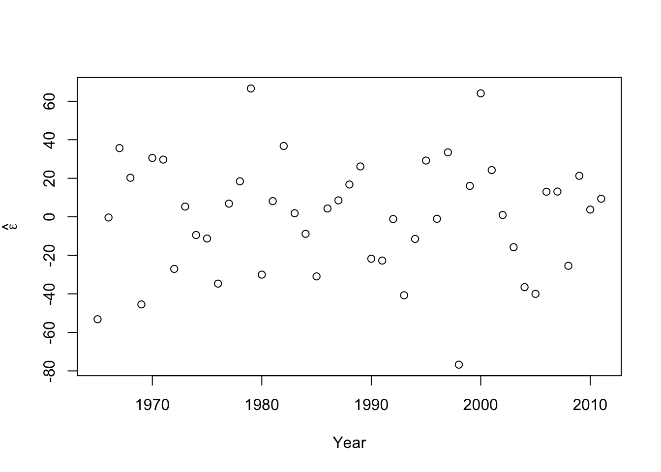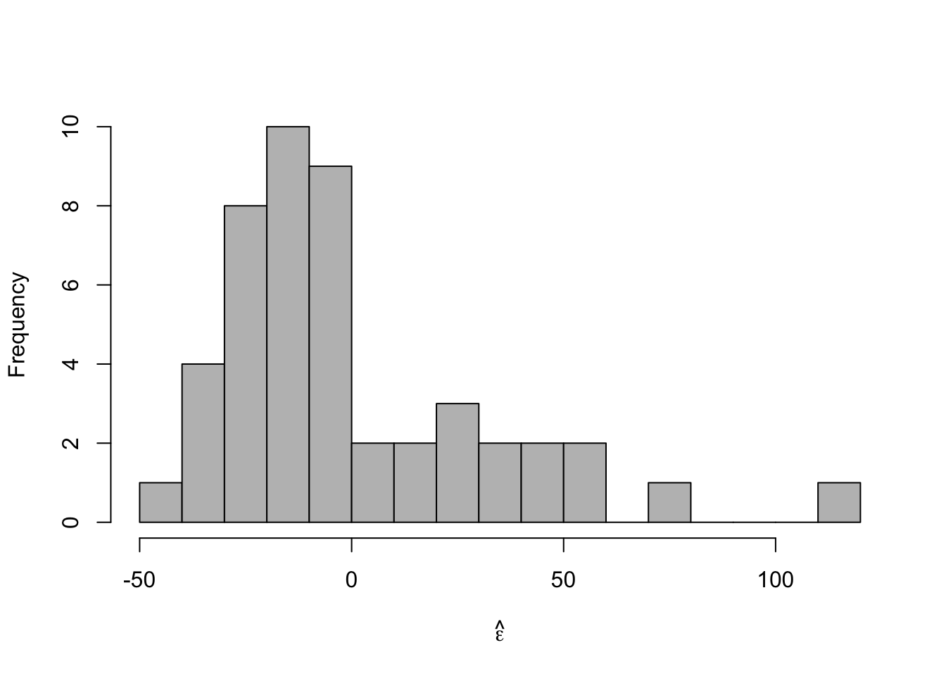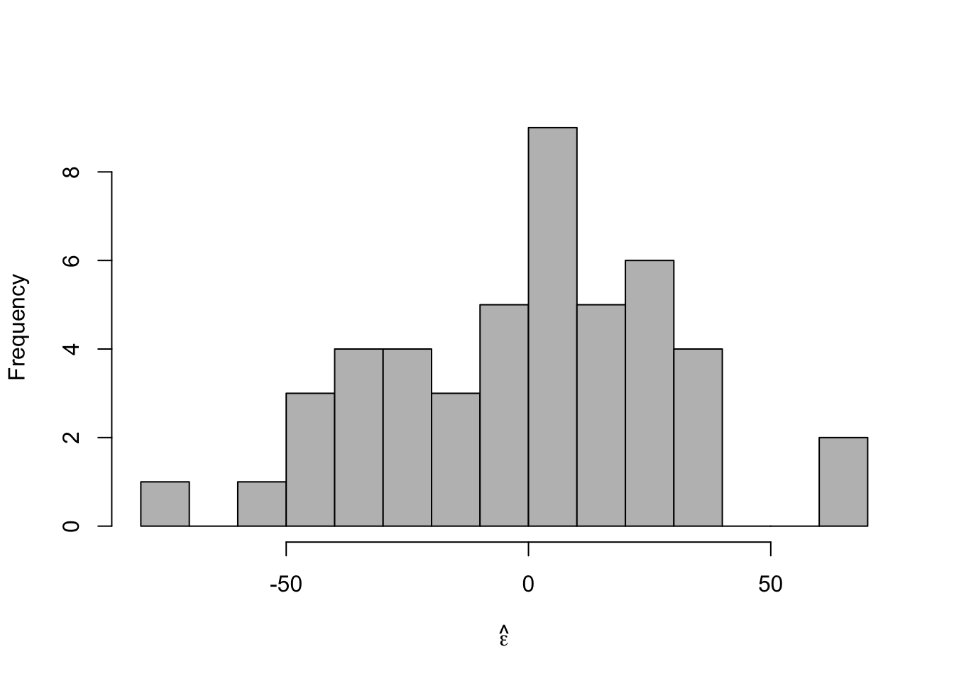 ## ## Call: ## lm(formula = y ~ year, data = df1) ## ## Residuals: ## Min 1Q Median 3Q Max ## -76.757 -22.237 3.767 19.353 66.634 ## ## Coefficients: ## Estimate Std. Error t value Pr(>|t|) ## (Intercept) 1717.2121 638.5293 2.689 0.0100 * ## year -0.8272 0.3212 -2.575 0.0134 * ## --- ## Signif. codes: 0 '***' 0.001 '**' 0.01 '*' 0.05 '.' 0.1 ' ' 1 ## ## Residual standard error: 29.87 on 45 degrees of freedom ## Multiple R-squared: 0.1285, Adjusted R-squared: 0.1091 ## F-statistic: 6.632 on 1 and 45 DF, p-value: 0.01337- Histogram of \(\hat{\boldsymbol{\varepsilon}}\)