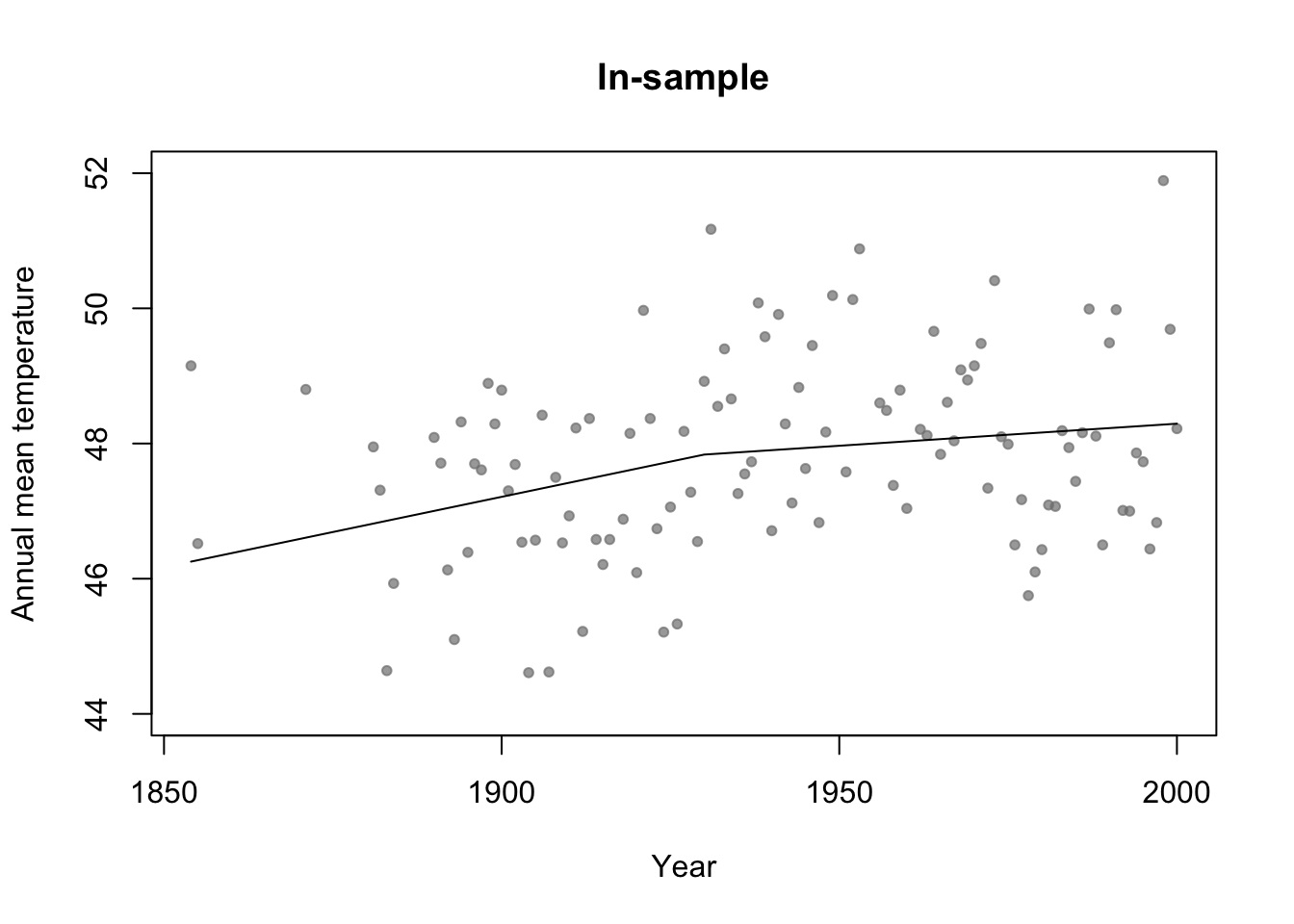 plot(df.in_sample$year,df.in_sample$temp,main="In-sample",xlab="Year",ylab="Annual mean temperature",ylim=c(44,52),pch=20,col=rgb(0.5,0.5,0.5,0.7))