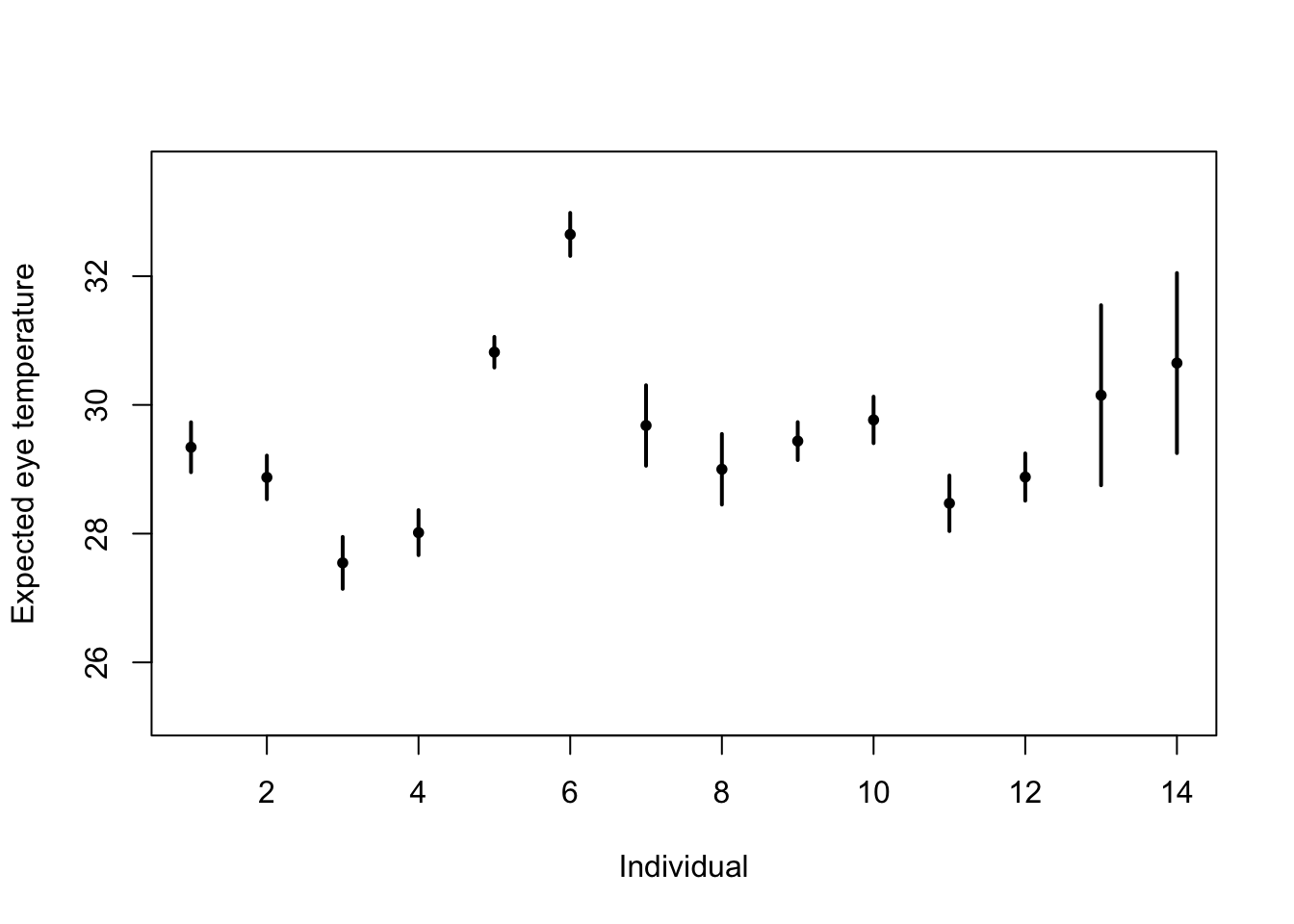 # Standard 'fixed effects' linear regression model m1 <- lm(eyetemp ~ as.factor(id.num) - 1, data = df.et) summary(m1)## ## Call: ## lm(formula = eyetemp ~ as.factor(id.num) - 1, data = df.et) ## ## Residuals: ## Min 1Q Median 3Q Max ## -3.7378 -0.5750 0.1507 0.6622 3.0286 ## ## Coefficients: ## Estimate Std. Error t value Pr(>|t|) ## as.factor(id.num)1 29.3423 0.1972 148.77 <2e-16 *** ## as.factor(id.num)2 28.8735 0.1725 167.41 <2e-16 *** ## as.factor(id.num)3 27.5458 0.2053 134.19 <2e-16 *** ## as.factor(id.num)4 28.0156 0.1778 157.59 <2e-16 *** ## as.factor(id.num)5 30.8188 0.1211 254.56 <2e-16 *** ## as.factor(id.num)6 32.6486 0.1700 192.06 <2e-16 *** ## as.factor(id.num)7 29.6800 0.3180 93.33 <2e-16 *** ## as.factor(id.num)8 29.0000 0.2789 103.97 <2e-16 *** ## as.factor(id.num)9 29.4378 0.1499 196.36 <2e-16 *** ## as.factor(id.num)10 29.7667 0.1836 162.12 <2e-16 *** ## as.factor(id.num)11 28.4714 0.2195 129.74 <2e-16 *** ## as.factor(id.num)12 28.8793 0.1867 154.64 <2e-16 *** ## as.factor(id.num)13 30.1500 0.7111 42.40 <2e-16 *** ## as.factor(id.num)14 30.6500 0.7111 43.10 <2e-16 *** ## --- ## Signif. codes: 0 '***' 0.001 '**' 0.01 '*' 0.05 '.' 0.1 ' ' 1 ## ## Residual standard error: 1.006 on 358 degrees of freedom ## Multiple R-squared: 0.9989, Adjusted R-squared: 0.9989 ## F-statistic: 2.31e+04 on 14 and 358 DF, p-value: < 2.2e-16plot(df.et$id.num, df.et$eyetemp, xlab = "Individual", ylab = "Expected eye temperature", col = "white") points(1:14, coef(m1), pch = 20, col = "black", cex = 1) segments(1:14, confint(m1)[, 1], 1:14, confint(m1)[, 2], lwd = 2, lty = 1)