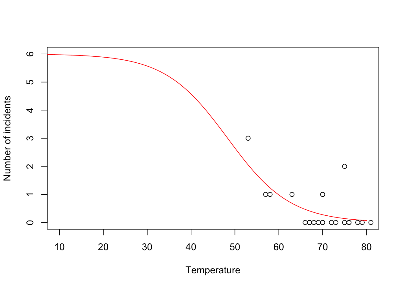 challenger <- read.csv("https://www.dropbox.com/s/ezxj8d48uh7lzhr/challenger.csv?dl=1") plot(challenger$Temp,challenger$O.ring,xlab="Temperature",ylab="Number of incidents",xlim=c(10,80),ylim=c(0,6))