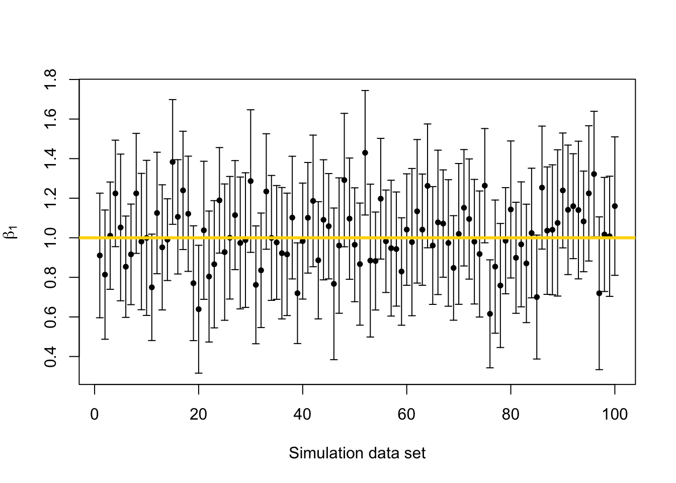 library(latex2exp) library(plotrix) beta.truth <- c(3,1) # True value of beta sigma2.truth <- 1000 # True value of sigma2 n <- 50 # Sample size for each simulated data set x <- seq(1,100,length.out = n) # Covariate X <- model.matrix (~x) # Design matrix q.sims <- 10^2 # How many data sets should I simulate? sim.results <- matrix(,nrow=q.sims,ncol=3) colnames(sim.results) <- c("beta_1","lower.limit","upper.limit") set.seed(9409) for(i in 1:q.sims){ y <- X%*%beta.truth + rnorm(n,0,sqrt(sigma2.truth)) # Generate data m1 <- lm(y~x) sim.results[i,1:3] <- c(coef(m1)[2],confint(m1)[2,]) } # Mean of beta1 mean(sim.results[,1])## [1] 1.013225# Plot confidence interval library(plotrix) plotCI(c(1:q.sims),sim.results[,1],li=sim.results[,2],ui=sim.results[,3], sfrac=0.005,pch=20,xlab="Simulation data set",ylab=expression(beta[1])) abline(a=beta.truth[2],b=0,col="gold",lwd=3)