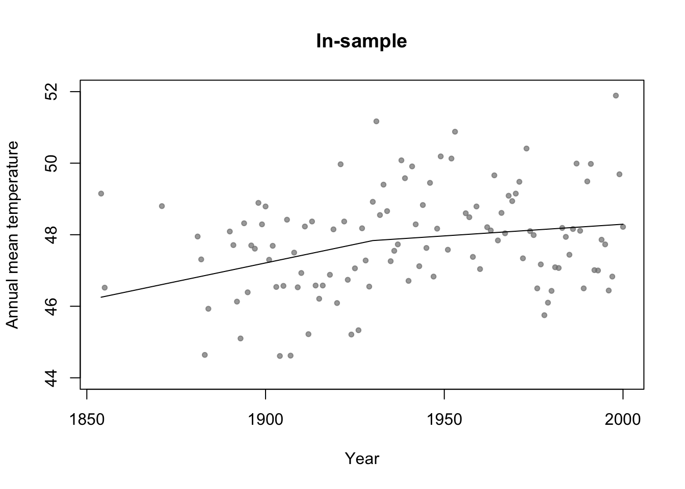 # Broken stick basis function f1 <- function(x,c){ifelse(x<c,c-x,0)} f2 <- function(x,c){ifelse(x>=c,x-c,0)} m3 <- lm(temp ~ f1(year,1930) + f2(year,1930),data=df.in_sample) par(mfrow=c(1,1)) # Plot predictions (in-sample) plot(df.in_sample$year,df.in_sample$temp,main="In-sample",xlab="Year",ylab="Annual mean temperature",ylim=c(44,52),pch=20,col=rgb(0.5,0.5,0.5,0.7)) lines(df.in_sample$year,predict(m3))
