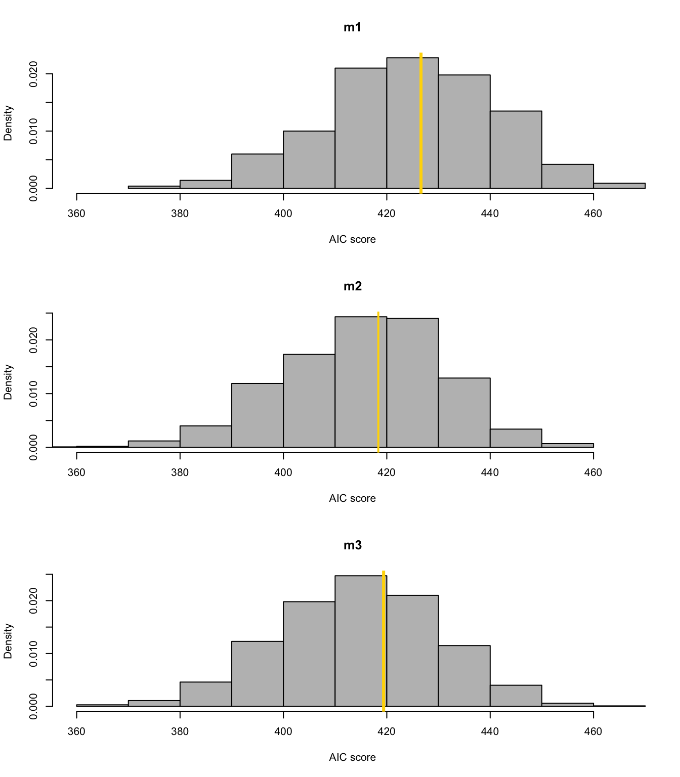 library(mosaic) boot <- function(){ m1 <- lm(temp ~ 1,data=resample(df.in_sample)) m2 <- lm(temp ~ year,data=resample(df.in_sample)) m3 <- lm(temp ~ f1(year,1930) + f2(year,1930),data=resample(df.in_sample)) cbind(AIC(m1),AIC(m2),AIC(m3))} bs.aic.samplles <- do(1000)*boot() par(mfrow=c(3,1)) hist(bs.aic.samplles[,1],col="grey",main="m1",freq=FALSE,xlab="AIC score",xlim=range(bs.aic.samplles)) abline(v=AIC(m1),col="gold",lwd=3) hist(bs.aic.samplles[,2],col="grey",main="m2",freq=FALSE,xlab="AIC score",xlim=range(bs.aic.samplles)) abline(v=AIC(m2),col="gold",lwd=2) hist(bs.aic.samplles[,3],col="grey",main="m3",freq=FALSE,xlab="AIC score",xlim=range(bs.aic.samplles)) abline(v=AIC(m3),col="gold",lwd=3)